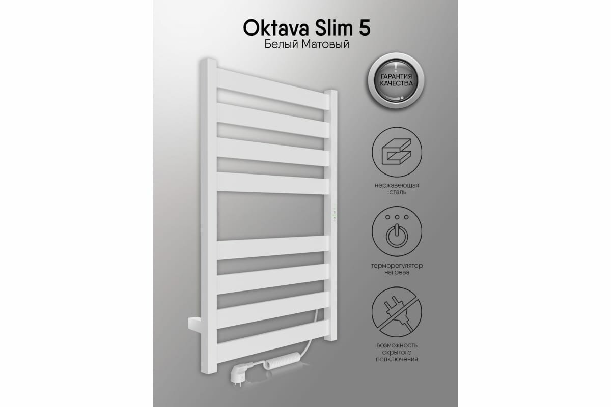 Полотенцесушитель Oktava Slim 5 электрический 80/50 таймер, скрытый монтаж, универсальное подключение, Белый матовый INDIGO
