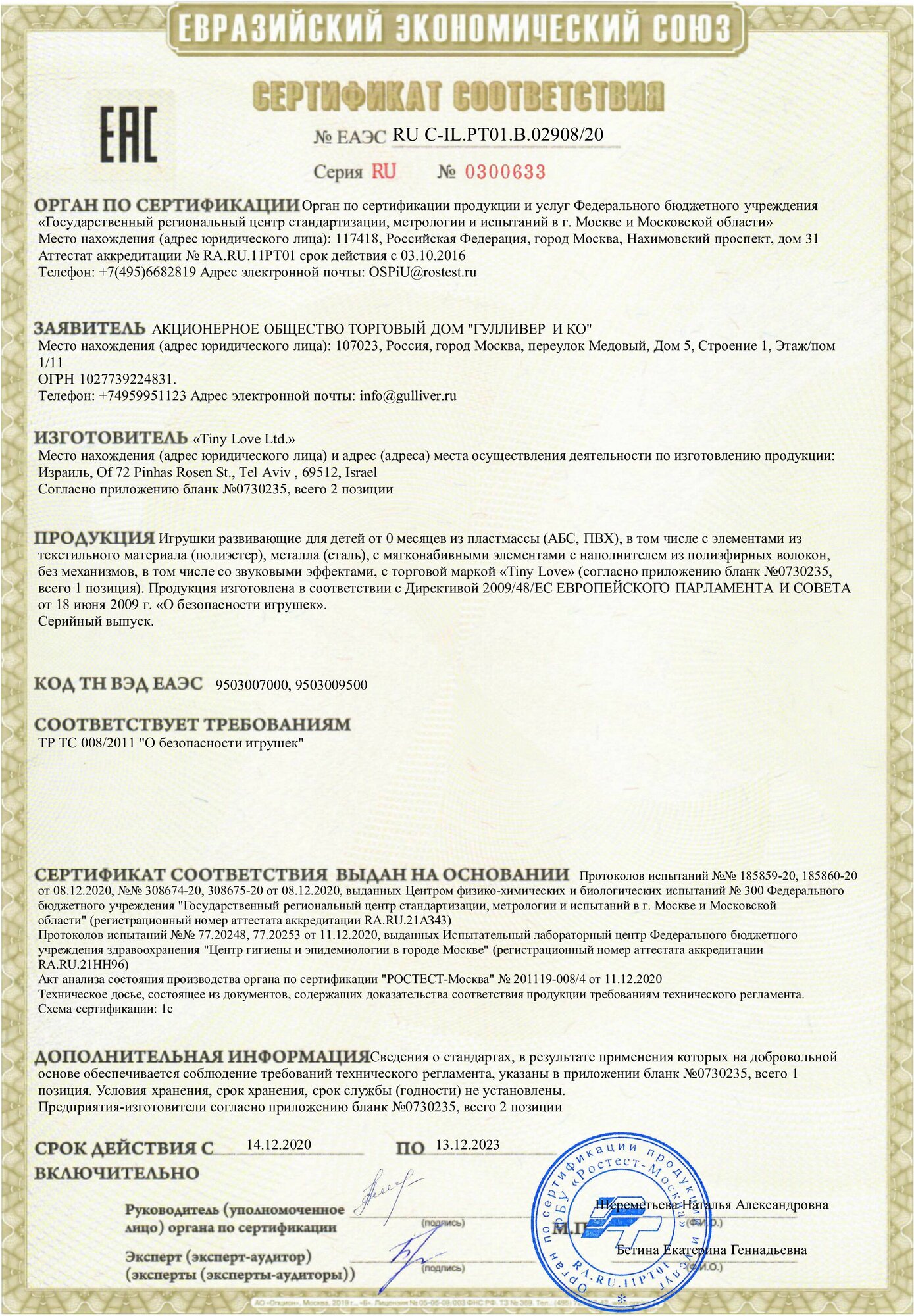 | Дополнительная информация | 3 варианта использования: классический музыкальный мобиль (1 уникальная мелодия, длительность звучания 30 мин), реакция на нажатия, беззвучный режим карусели; 2 съёмные подвесные игрушки (голография, зеркальце, ниточки, текстуры); крутящаяся картинка |