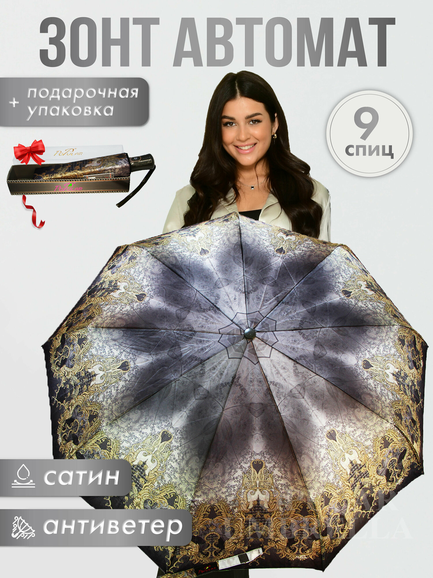 Зонт женский автомат, зонтик взрослый складной антиветер 1290, черный,серый