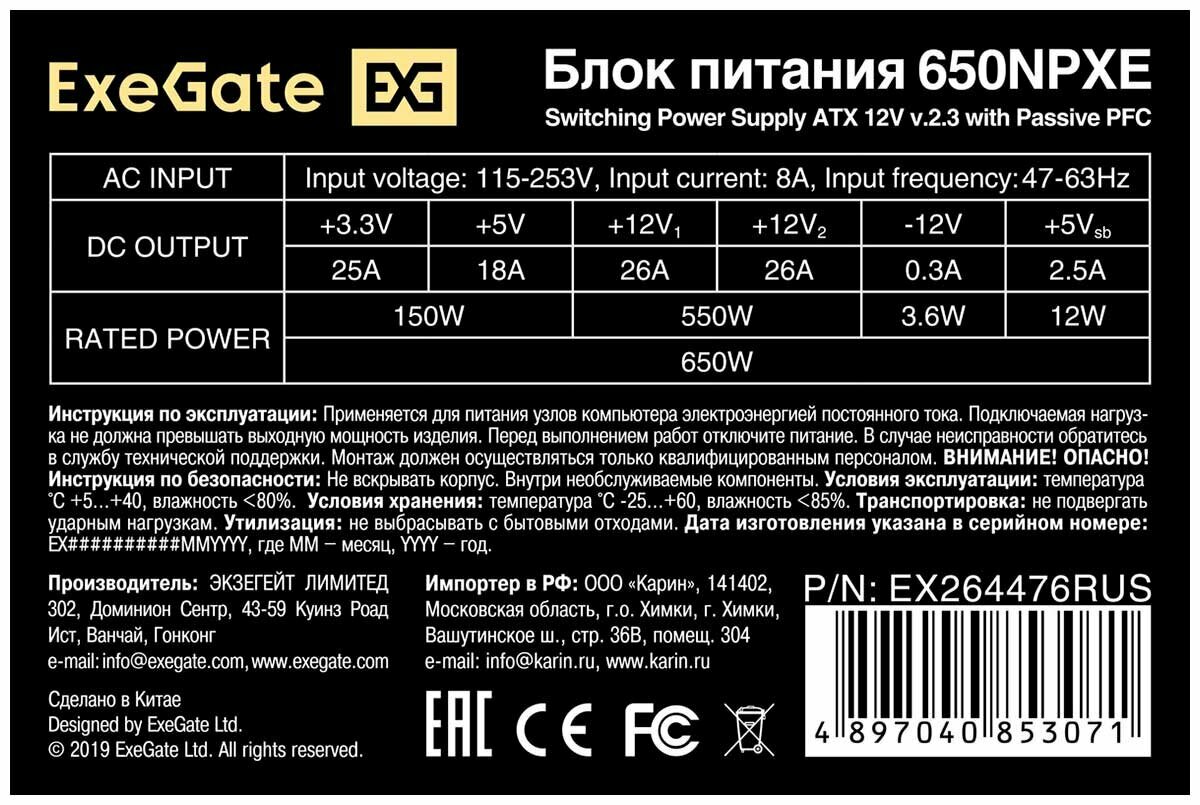Блок питания 650W ExeGate 650NPXE (ATX, PPFC, 12cm fan, 24pin, 2x(4+4)pin, 2xPCI-E, 5xSATA, 3xIDE, black) EX264476RUS