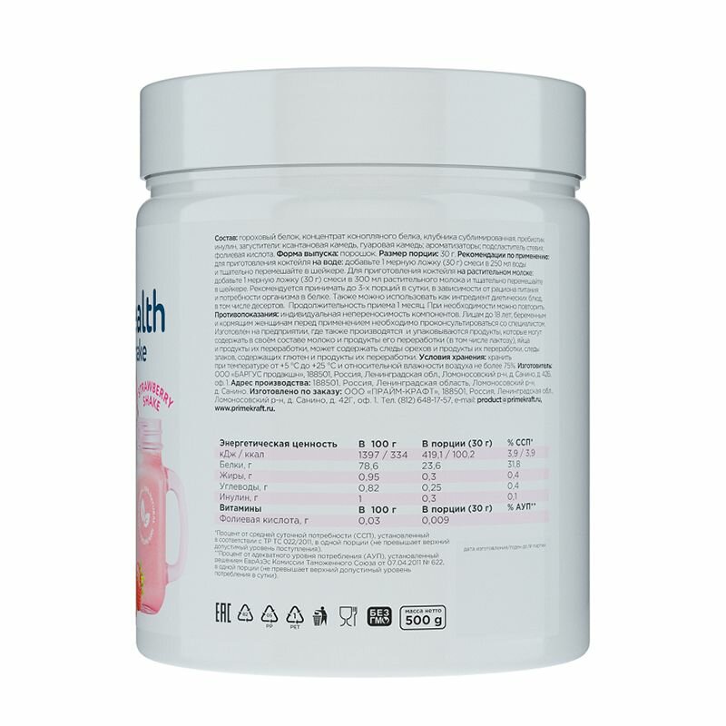 | Дополнительная информация | рекомендации по применению: для приготовления коктейля на воде:добавьте 1 мерную ложку(30 г) смеси в 250 мл воды и тщательно перемешайте в шейкере. Для приготовления коктейля на растительном молоке: добавьте одну мерную ложку (30 г) смеси в 300 мл растительного молока и тщательно перемешайте в шейкере. Рекомендуется принимать до 3-х порций в сутки, в зависимости от рациона питания и потребности организма в белке. Также можно использовать как ингредиент диетических блюд, в том числе десертов.; состав: гороховый белок, концентрат конопляного белка, клубника сублимированная, пребиотик инулин, загустители: ксантовая камедь, гуаровая камедь; ароматизаторы, подсластитель стевия, фолиевая кислота |