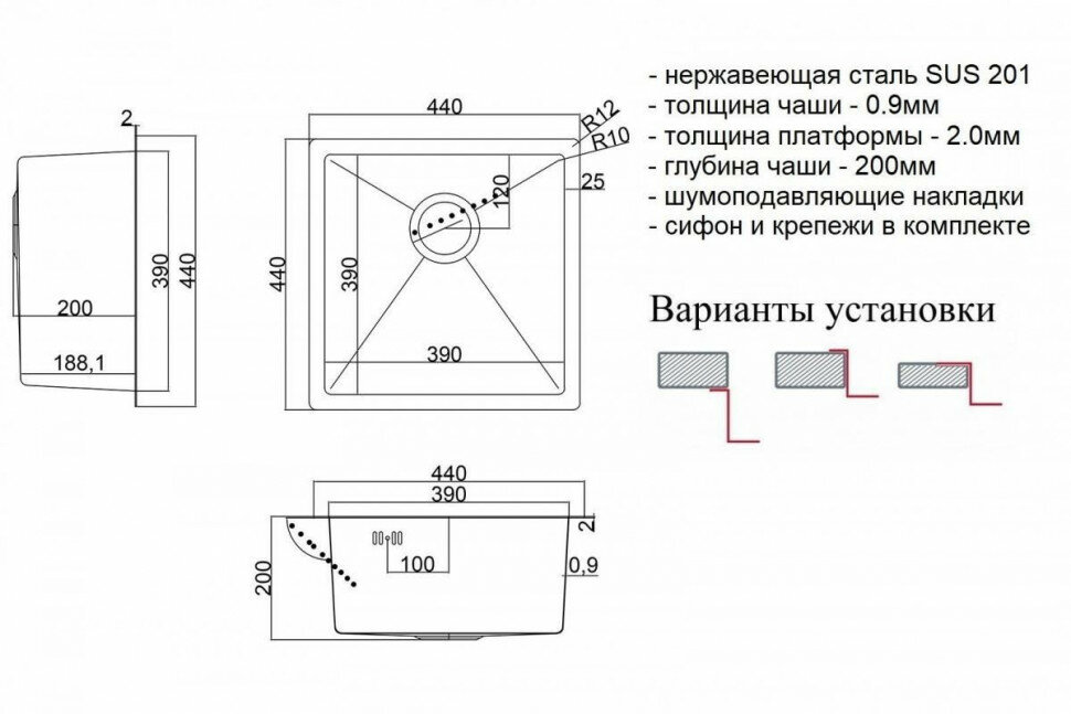 | Дополнительная информация | мойка, сливная арматура с корзинчатым вентилем 3 1/2", сифон с отводом, комплект креплений |