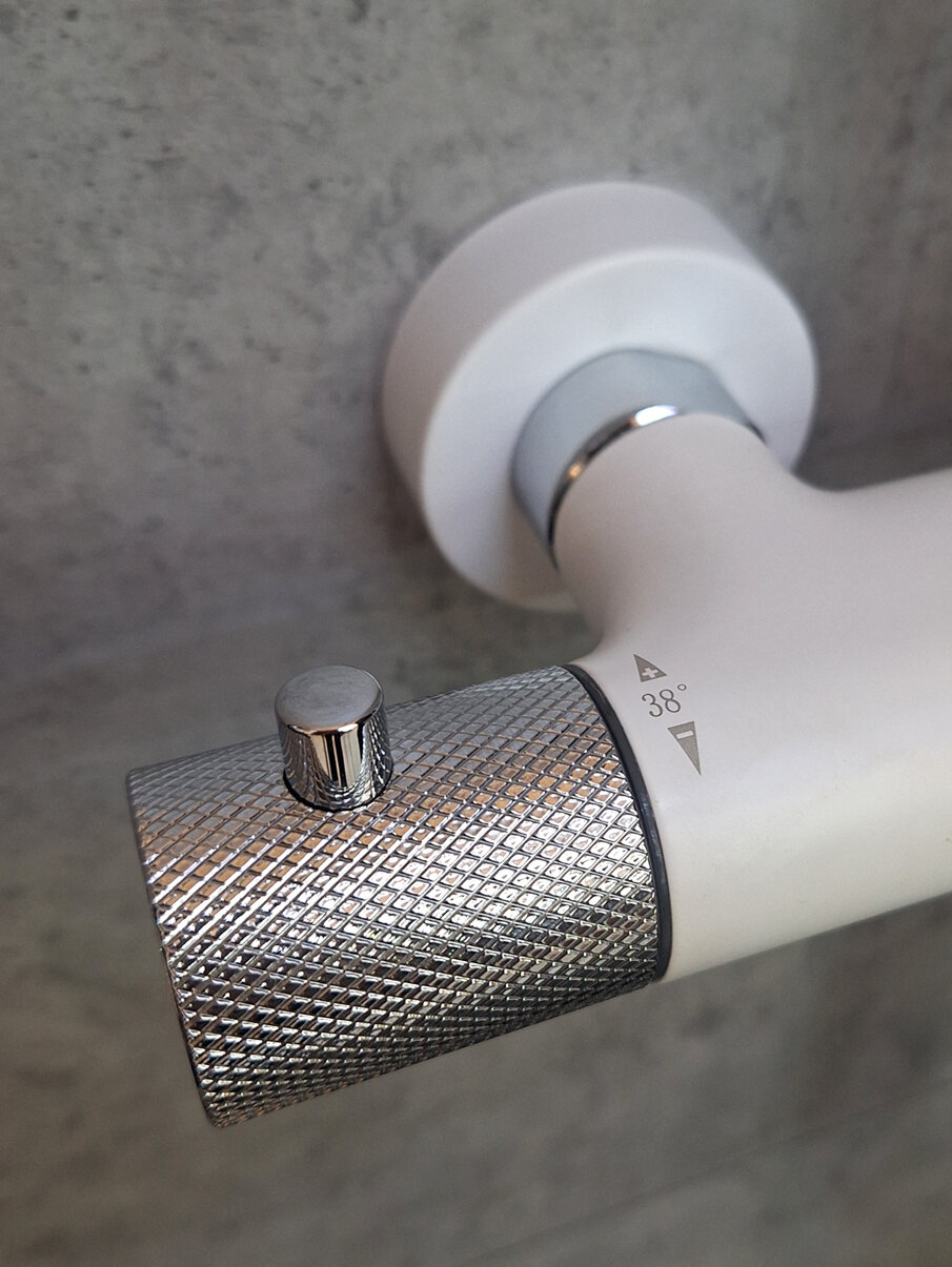 | Комплектация | термостатический смеситель настенного монтажа / телескопическая штанга / ручной душ / гибкий полимерный шланг / регулируемый по высоте латунный верхний душ / эксцентрики / чаши декоративные |