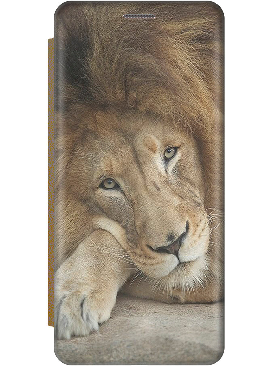СохранитьЧехол-книжка на Samsung Galaxy S10, Самсунг С10 с 3D принтом "Спокойный лев" золотой интересное: