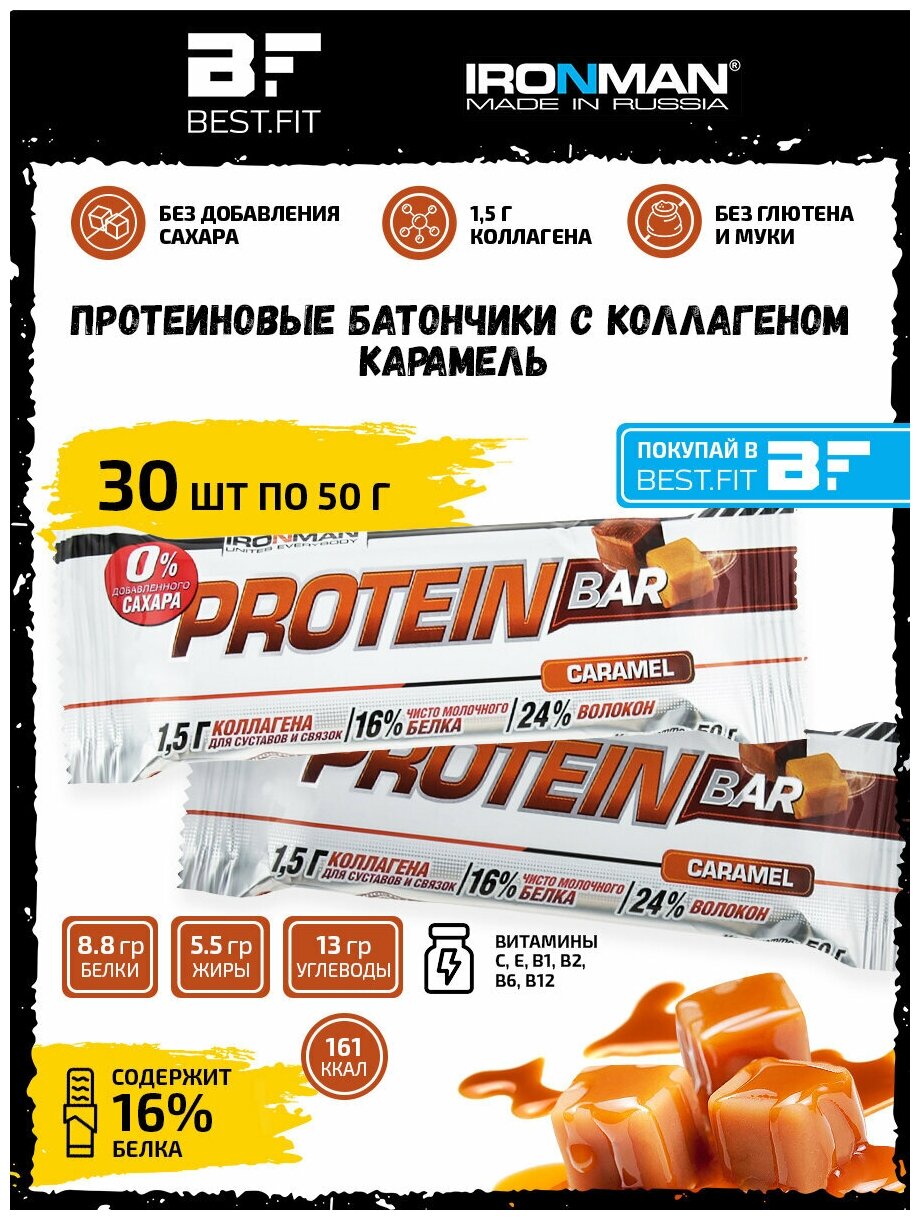 Ironman Protein bar без сахара (Карамель) 30х50г / Протеиновый батончик с коллагеном в шоколаде для похудения и набора мышечной массы женщин и мужчин