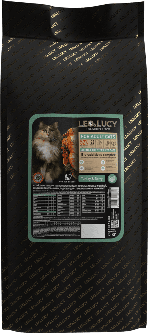 Сухой холистик корм для взрослых кошек LEO&LUCY полнорационный с индейкой, ягодами и биодобавками, подходит для стерилизованных и пожилых, 5 кг