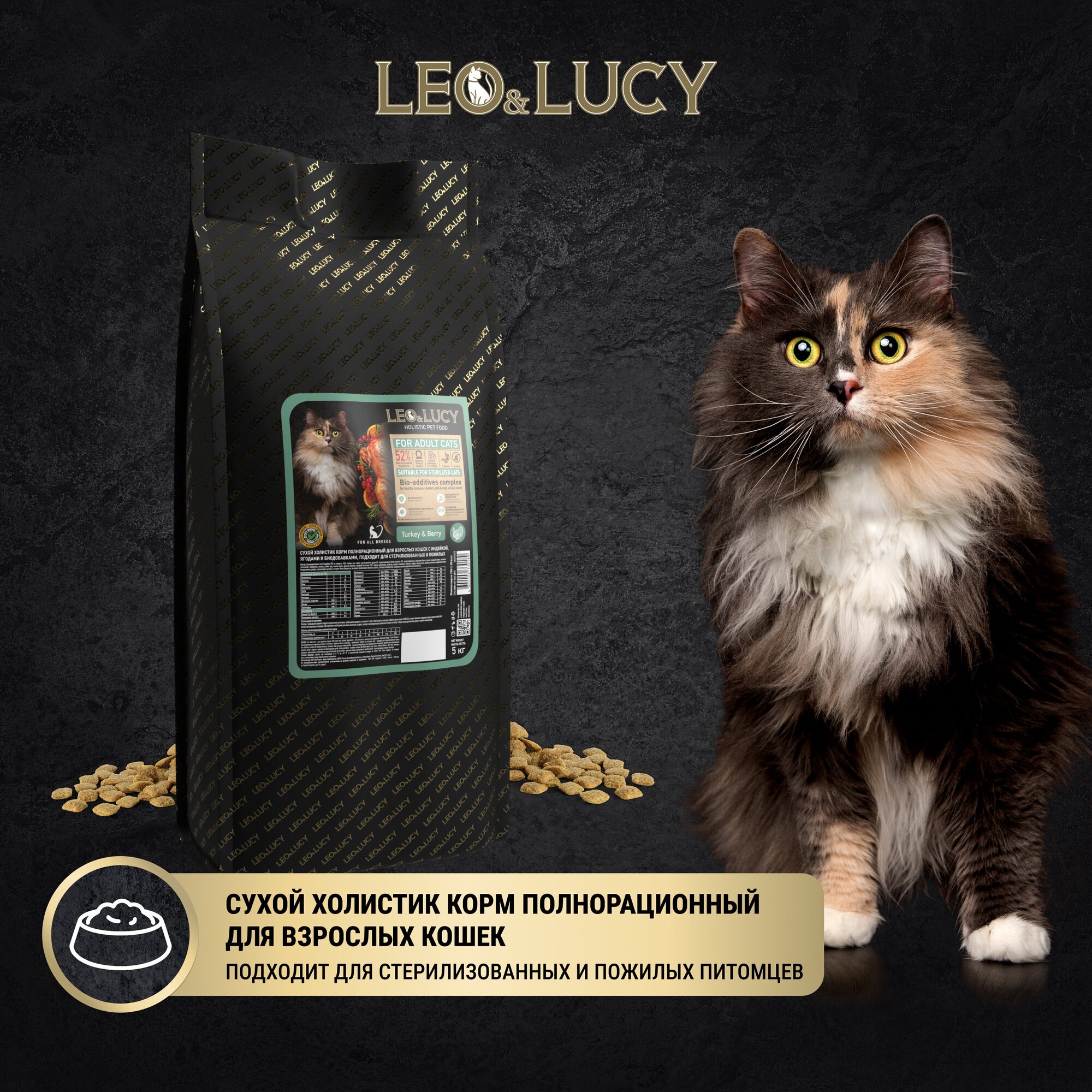 Купить LEO&LUCY сухой холистик корм полнорационный для взрослых кошек с индейкой, ягодами и биодобавками, подходит для стерилизованных и пожилых, 5 кг