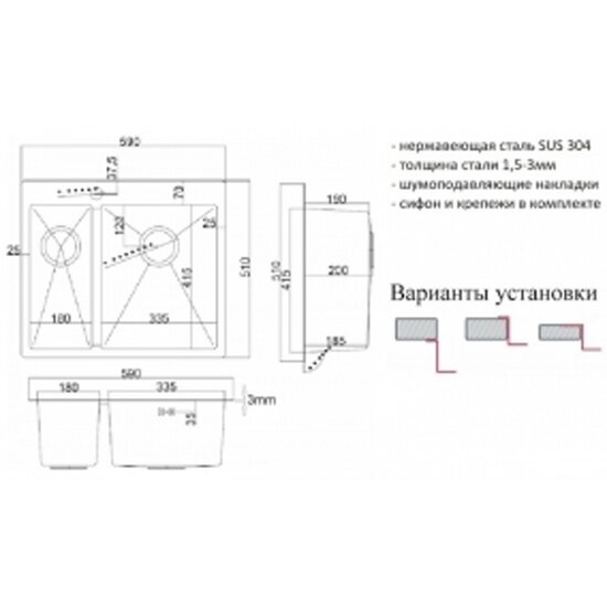 | Особенности | PVD покрытие / дополнительная чаша / корзинчатый вентиль / отверстие под смеситель / сливная арматура |
