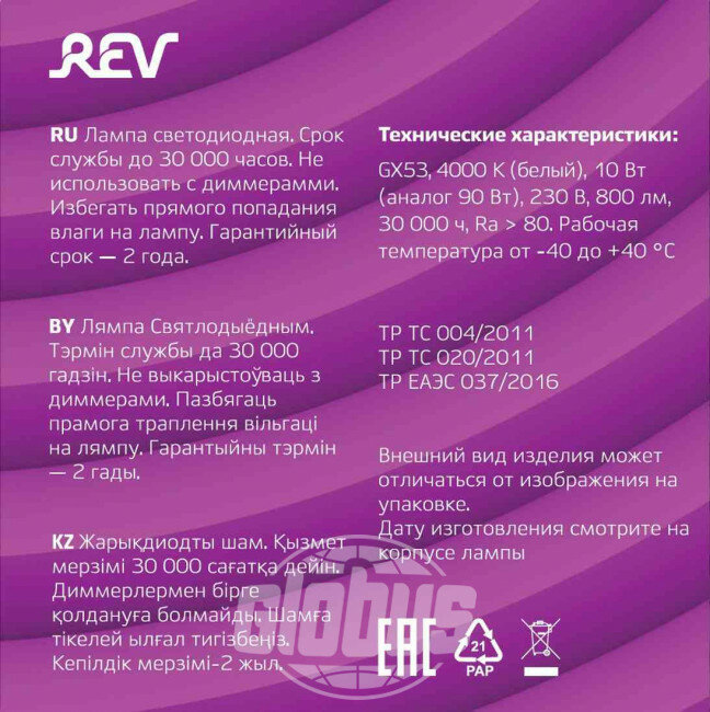 Лампа светодиодная REV GX53 10W 4000К нейтральный белый свет шар 32568 0