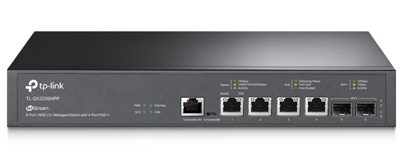 TP-Link TL-SX3206HPP, JetStream™ 6-портовый управляемый коммутатор с 4 портами PoE++ 10GBase-T и 2 слотами SFP+ 10GE уровня 2+
