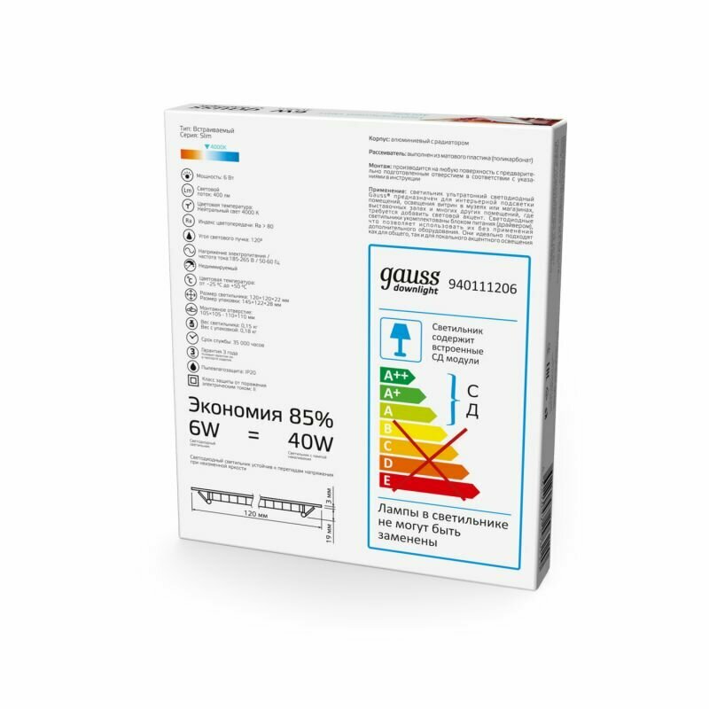 Светильник Gauss Slim квадрат 6W 400lm 4000K 180-265V IP20 монтаж Ø105*105 120*120*22 LED 1/20