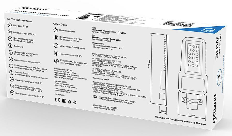 | Подробная комплектация | Уличное освещение Gauss 629535330 |