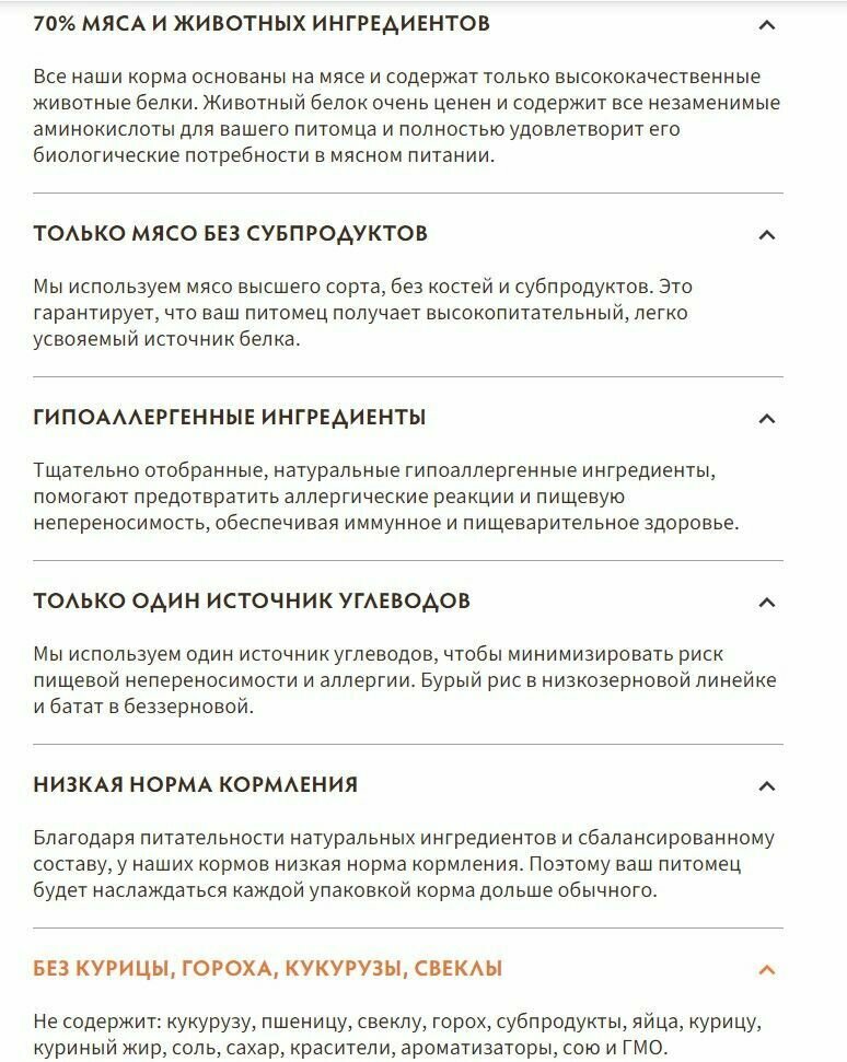 | Состав | Дегидрированная треска (23 %), дегидрированная сельдь (23 %), цельнозерновой коричневый рис, дегидрированное мясо индейки (17 %), жир индейки (5 %), сушеный антарктический криль (натуральный источник ЭПК и ДГК, 2 %), порошок корней цикория (натуральный источник пребиотиков: ФОС и инулин), сушеное яблоко, пивные дрожжи (натуральный источник МОС), сушеная морковь, сушеный шпинат, растительная клетчатка, льняное семя, сушеная клюква, Юкка Мохаве. |