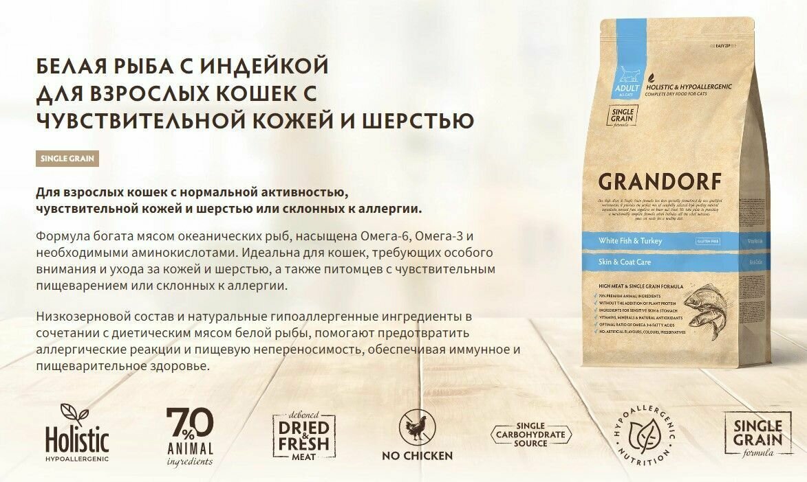 GRANDORF SINGLE GRAIN CAT ADULT SKIN & COAT CARE WHITE FISH & TURKEY низкозерновой для взрослых кошек с чувствительной кожей и шерстью с белой рыбой и индейкой (2 кг)
