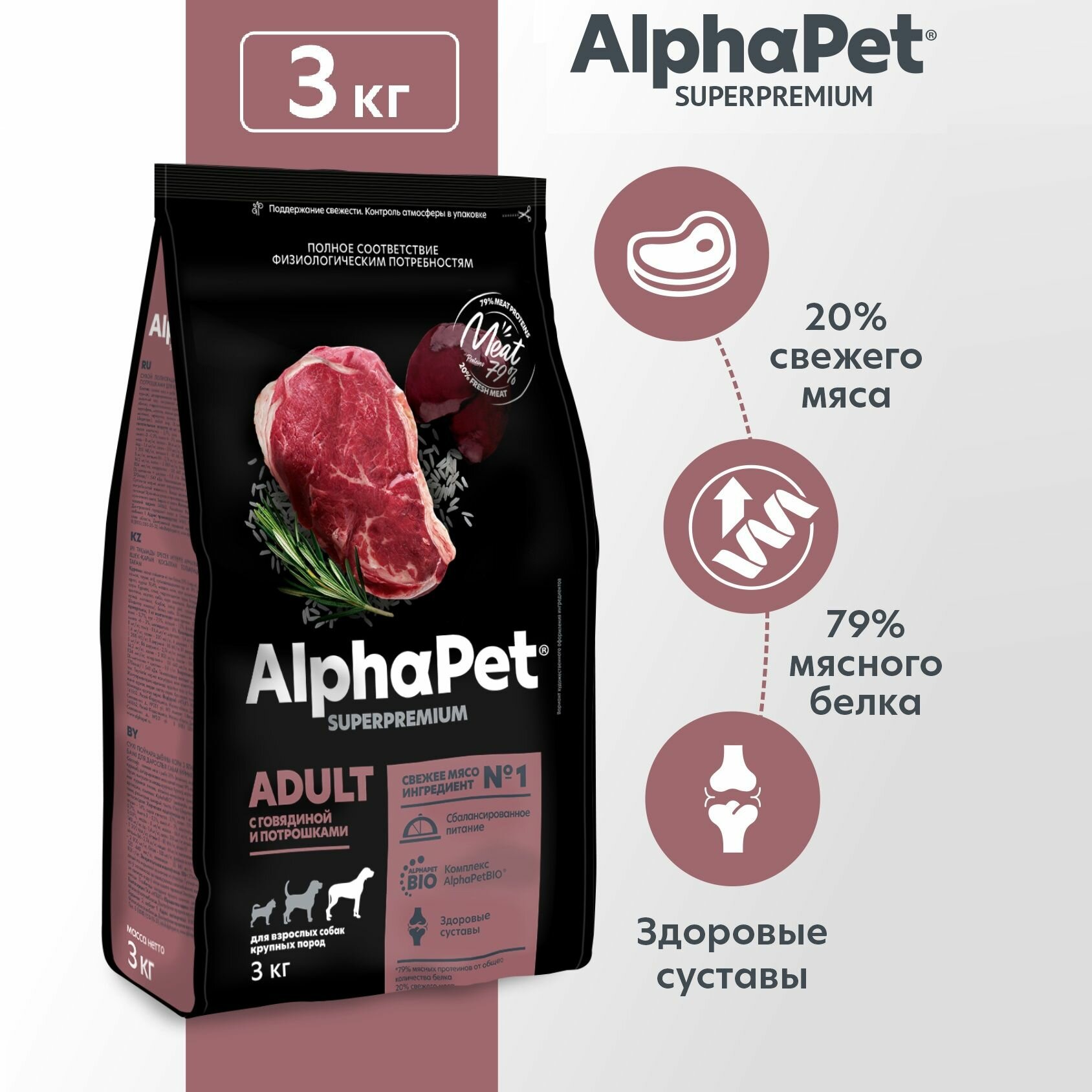Купить ALPHAPET SUPERPREMIUM ADULT для взрослых собак крупных пород с говядиной и потрошками (3 кг)