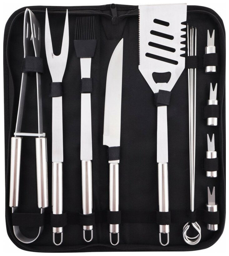 | Комплектация | Вилка, Шампур 33 см 4 шт, Вилка кукурузная 4 шт, Кисть кулинарная, Лопатка с отверстиями, Тканевый чехол, Щипцы для барбекю, Нож |
