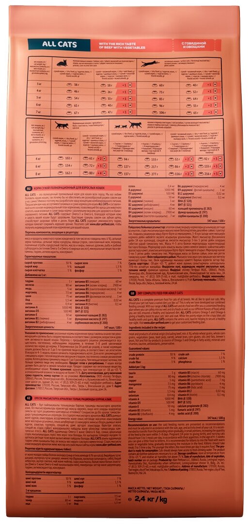 Сухой корм 2,4 кг для взрослых кошек ALL CATS говядина с овощами полнорационный/Аллер Петфуд