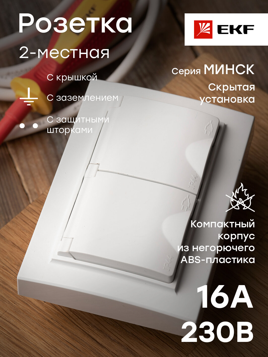 Розетка EKF Basic Минск 2-местная, скрытой установки, с заземлением, с защитной шторкой, IP44, 16А, белая