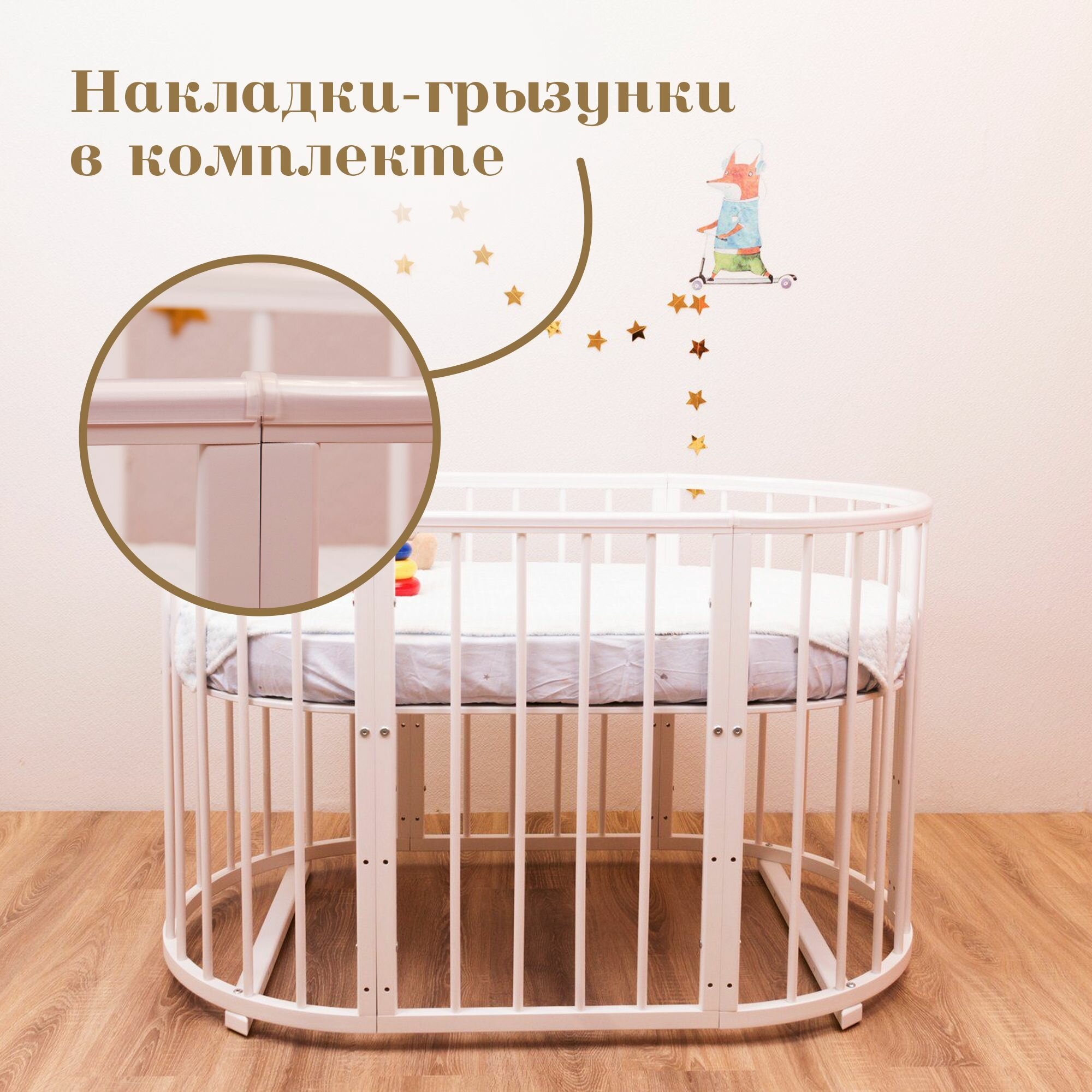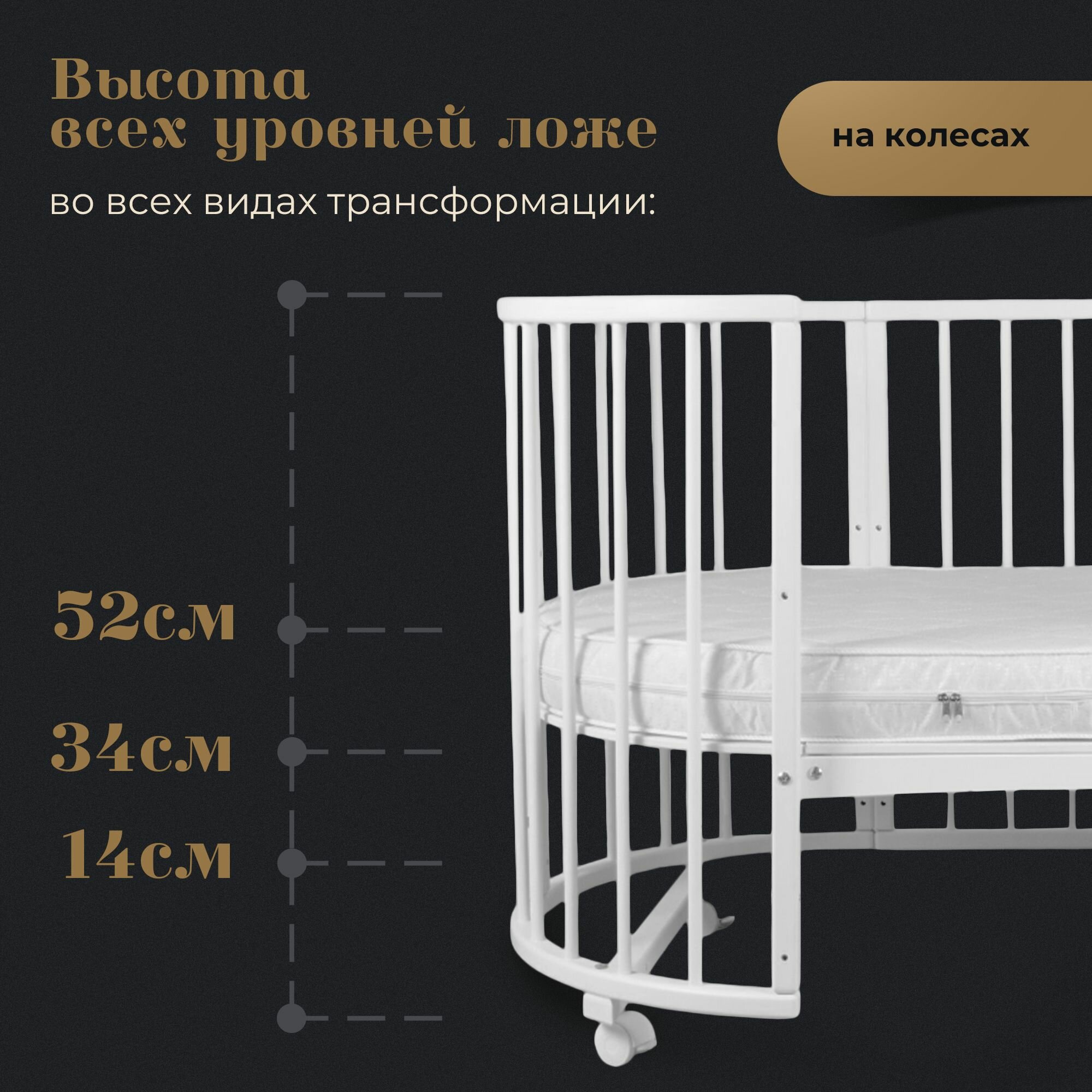 | Комплектация | Кроватка трансформер / комплект фурнитуры (колесики) / комплект матрасов (круглый / овальный) |
