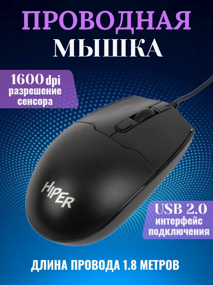 Мышь компьютерная Hiper OM-1100 черная, 1600DPi, 125Гц, проводная