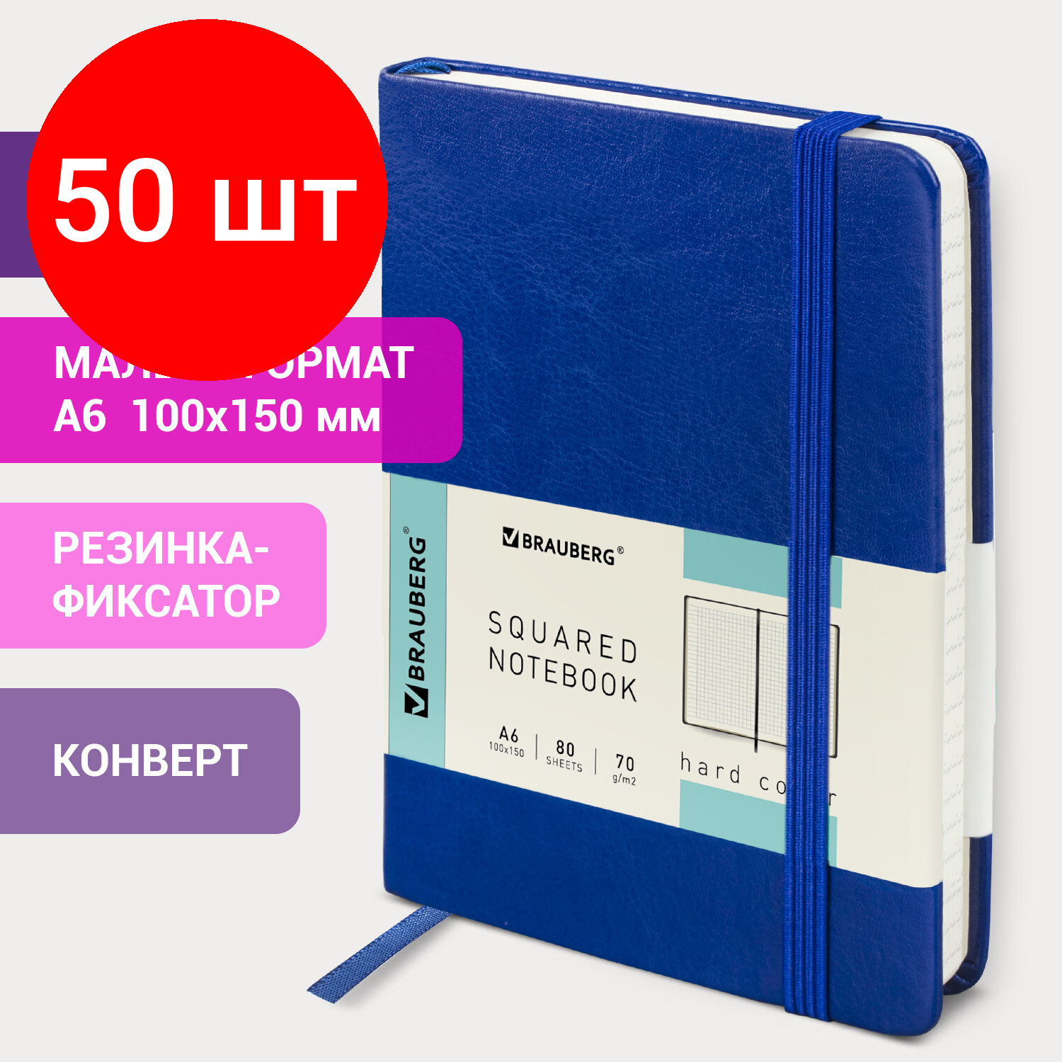 Комплект 50 шт, Блокнот в клетку с резинкой малый формат А6 (100x150 мм), 80 л., под кожу синий BRAUBERG "Metropolis Special", 111580