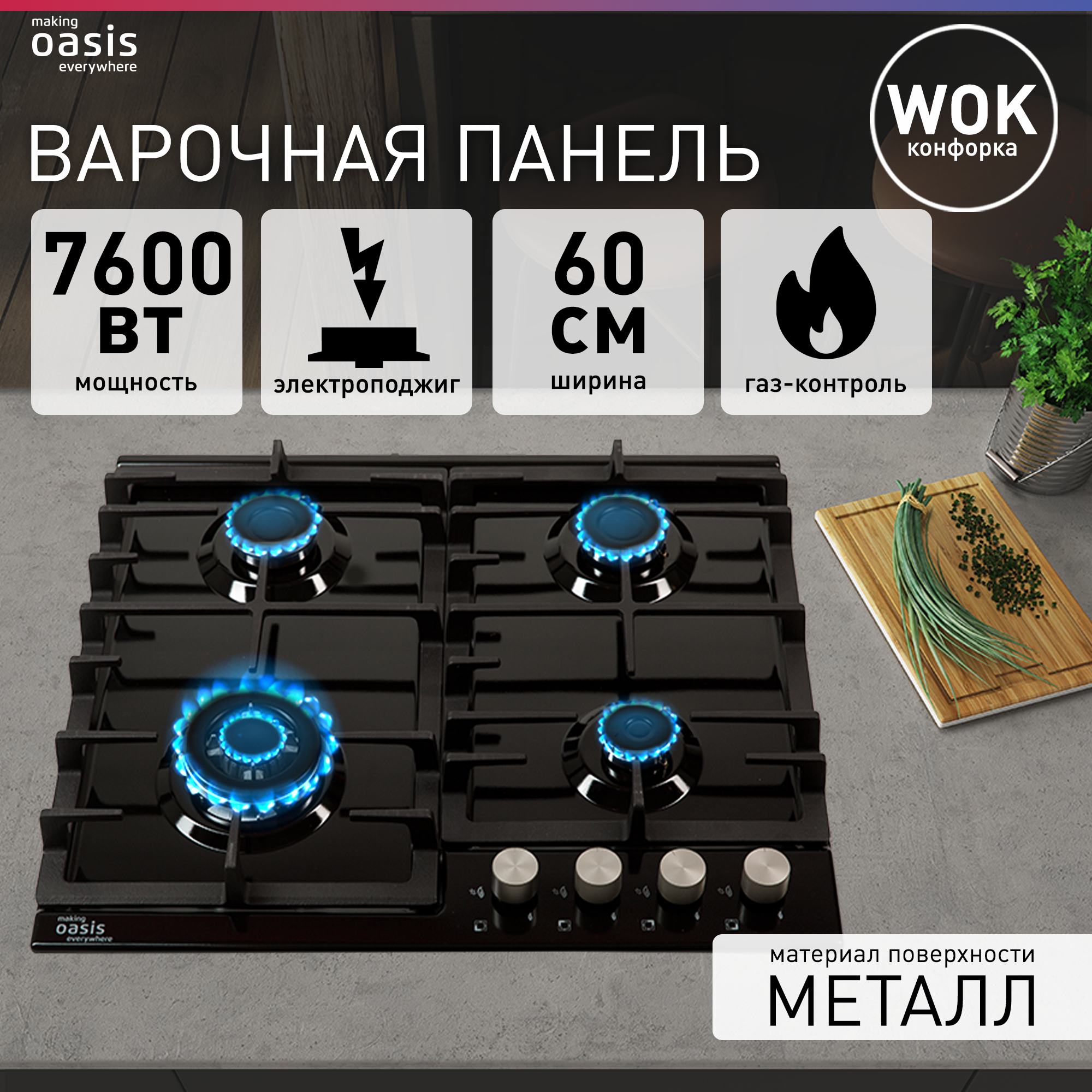 Газовая варочная панель встраиваемая Oasis P-MBRT, 4 конфорки