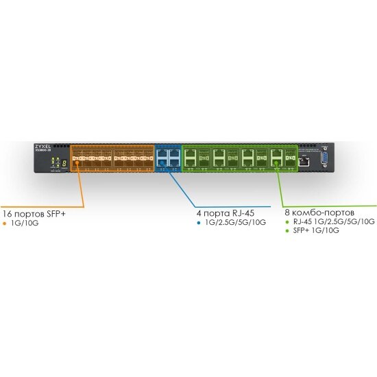 | Дополнительная информация | 4xRJ-45 (1/2,5/5/10G); 8xCombo (SFP: 1/10G, RJ-45: 1/2,5/5/10G); 16xSFP+ |