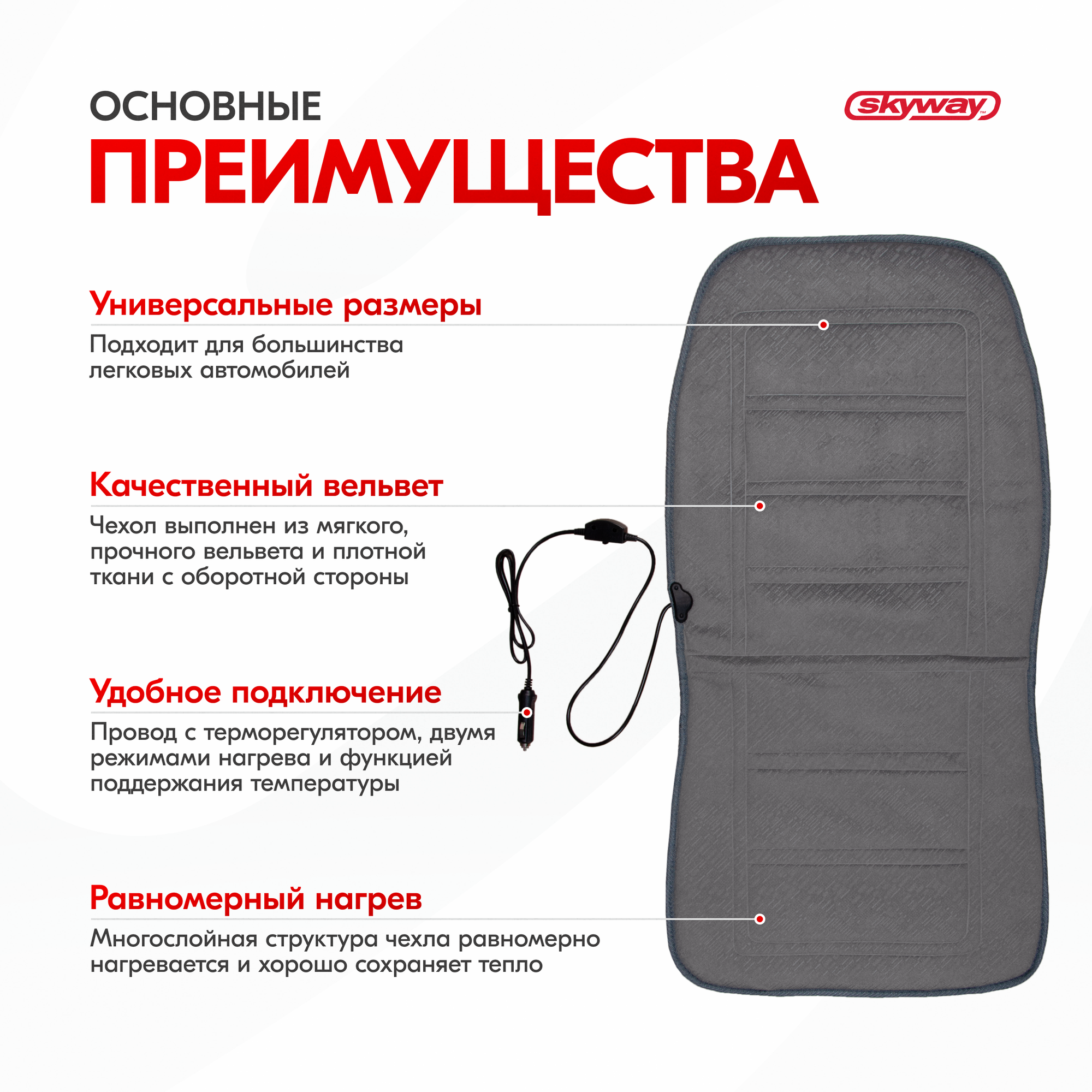 Купить SKYWAY S02201019 Накидка на сиденье с подогревом с терморегулятором (2 режима) 95х47см 12V Серый 2,5А-3А; SKYWAY