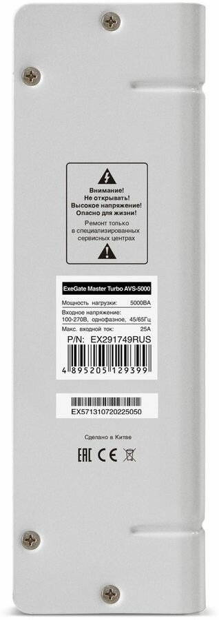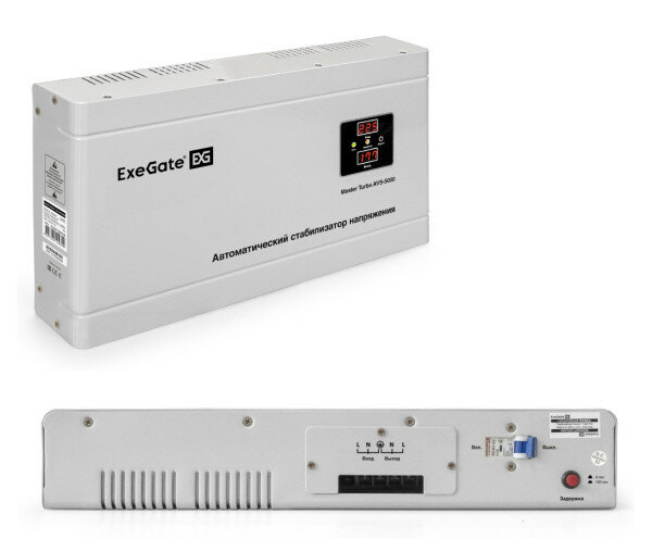Стабилизатор напряжения настенный ExeGate Master Turbo AVS-5000 (5000ВА, вход 100-265В, цифр. индикация вход/вых. напряжения, выход 220В±10%, КПД 98%, 5 уровней защиты, задержка, усиленный метал. корпус, клем. колодка, RTL) EX291749RUS
