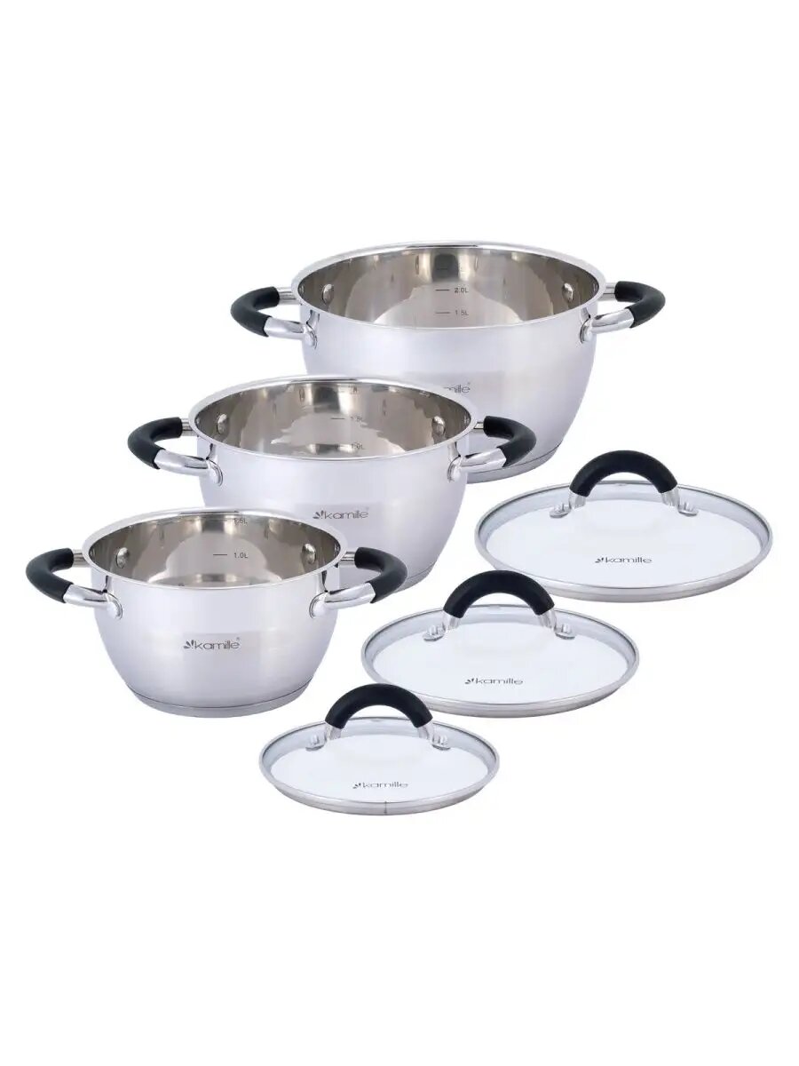 СохранитьНабор кастрюль 6 предметов из нержавеющей стали Kamille KM 5754 (1,8 л; 2,5 л; 3,5 л) с силиконовыми вставками на ручках (серебристый) интересное: