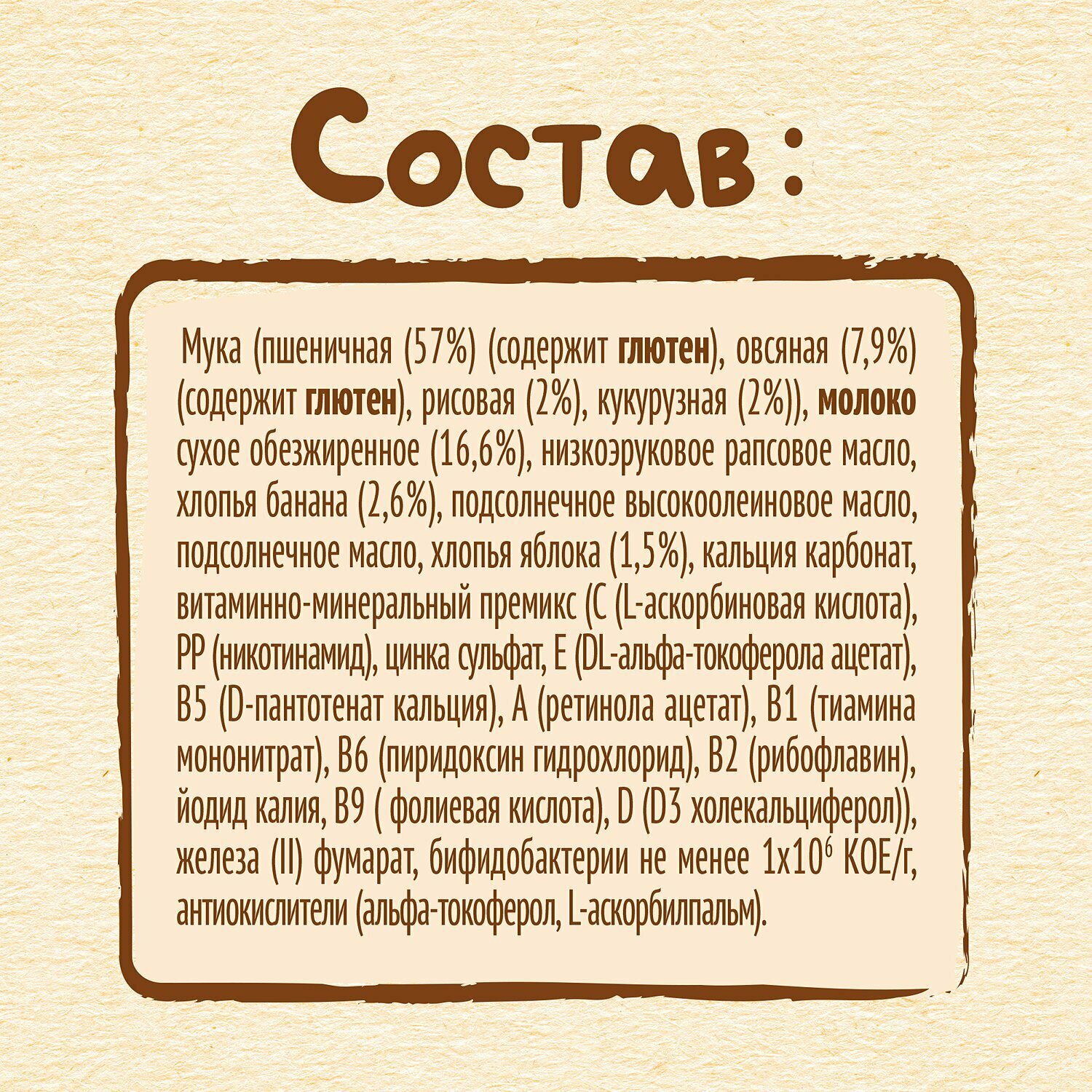 | Состав | мука (пшеничная (57%) (содержит глютен), овсяная (7,9%) (содержит глютен), рисовая (2%), кукурузная (2%)), молоко сухое обезжиренное (16,6%), смесь растительных масел (низкоэруковое рапсовое, подсолнечное высокоолеиновое, подсолнечное), антиокислители (L-аскорбилпальмитат, альфа-токоферол, лимонная кислота), хлопья банана (2,6%), хлопья яблока (1,5%), минеральные вещества (кальция карбонат, железа (II) фумарат, цинка сульфат, йодид калия), витамины (С (L-аскорбиновая кислота), E (DL-альфа-токоферола ацетат), РР (никотинамид), B5 (D-пантотенат кальция), A (ретинола ацетат), В1 (тиамина мононитрат), В6 (пиридоксин гидрохлорид), В2 (рибофлавин), B9 ( фолиевая кислота), D (D3 холекальциферол)), бифидобактерии не менее 1х10^6 КОЕ/г |