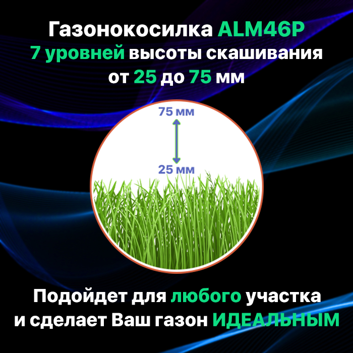 Газонокосилка бензиновая A-iPower ALM46P несамоходная (4,5 л. с, травосборник 60 л, ширина скашивания 46 см, высота 25-75 мм,28 кг)