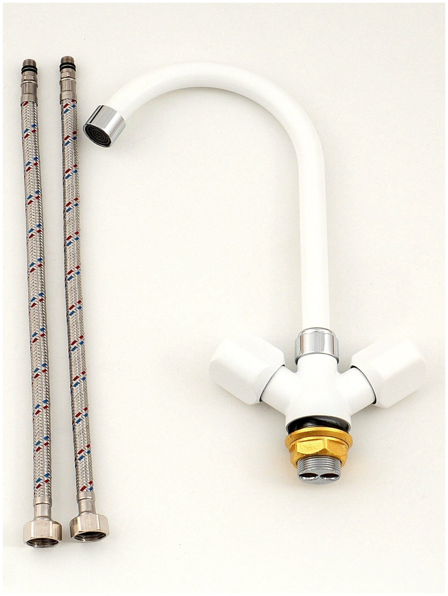 | Комплектация | смеситель, крепёж на гайке, две гибкие подводки 1/2" длиной 35 см, паспорт изделия |