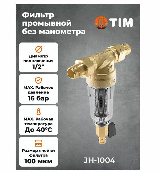 Tim Фильтр магистральный 1/2" без манометра, промывной (хол) TIM 1004