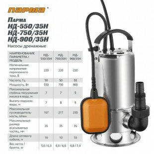 Насос погружной дренажный напор 7,0м 167л/мин 550Втч нержавейка IPX8 поплавок парма НД-550/35Н интересное: