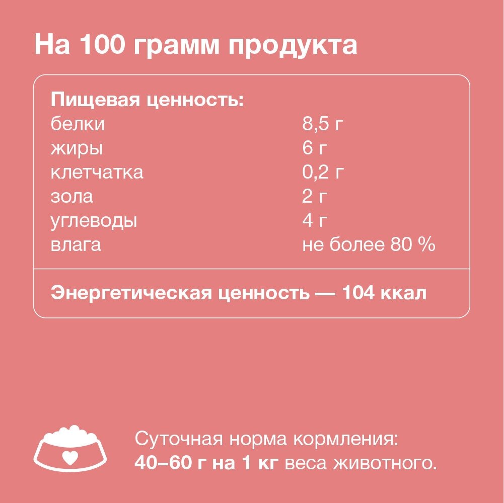 | Состав | телятина, рубец, печень, сердце, легкое, натуральная желирующая добавка, злаки (не более 2%), соль, растительное масло, вода |