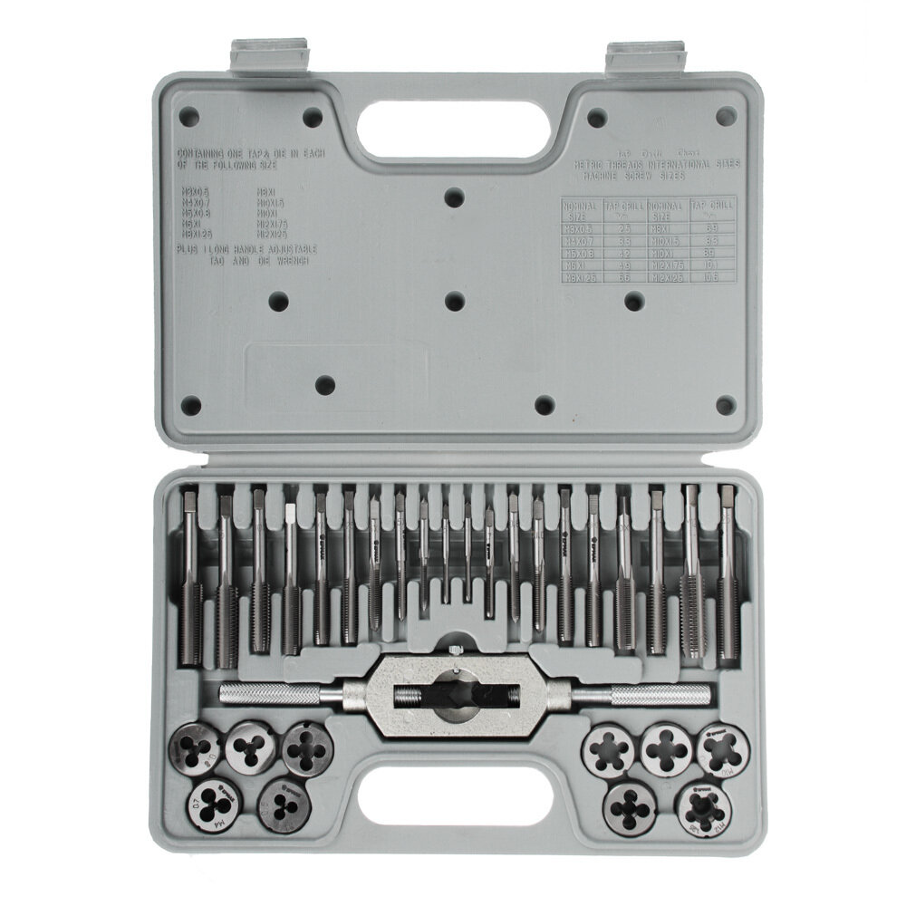 | Подробная комплектация | - 10 метчиков комплектных из 2 штук и 10 плашек: M3x0.5, M4x0.7, M5x0.8, M6x1.0, M8x1.0, M8x1.25, M10x1.0, M10x1.5, M12x1.25, M12x1.75; - плашко-метчикодержатель; - пластиковый кейс. |