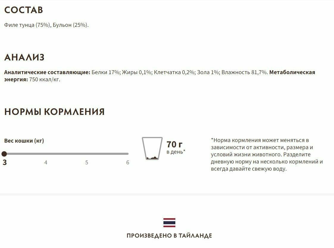 | Состав | 75% филе тунца, 25% собственный сок, 0% зерновых |