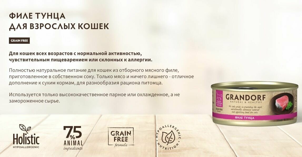 Влажный корм для кошек GRANDORF консервы с филе тунца 70 гр (6 штук) интересное: