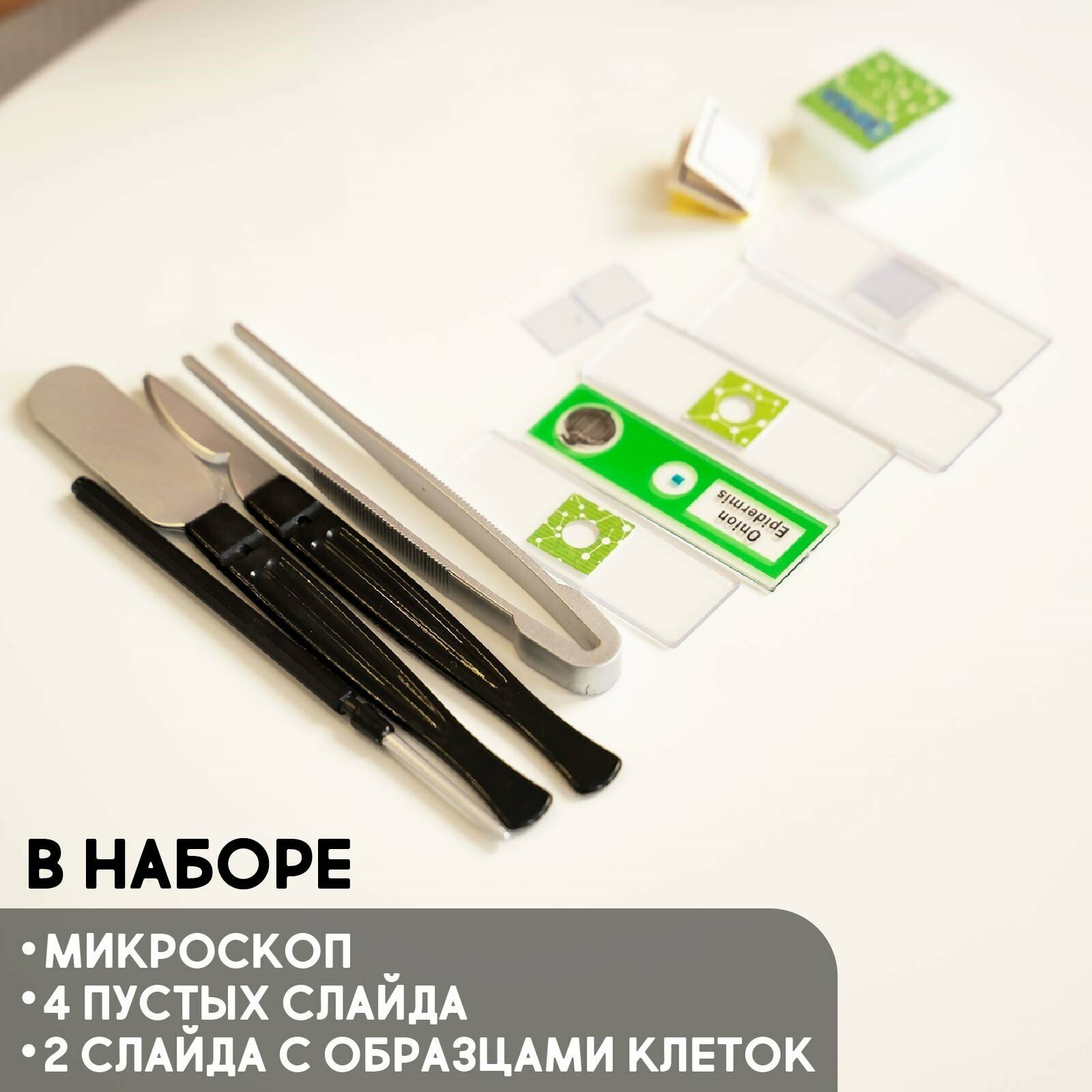 | Комплектация | микроскоп, 4 пустых слайда, 2 слайда с образцами клеток, пинцет, игла, лопатка, калейдоскоп, скальпель |