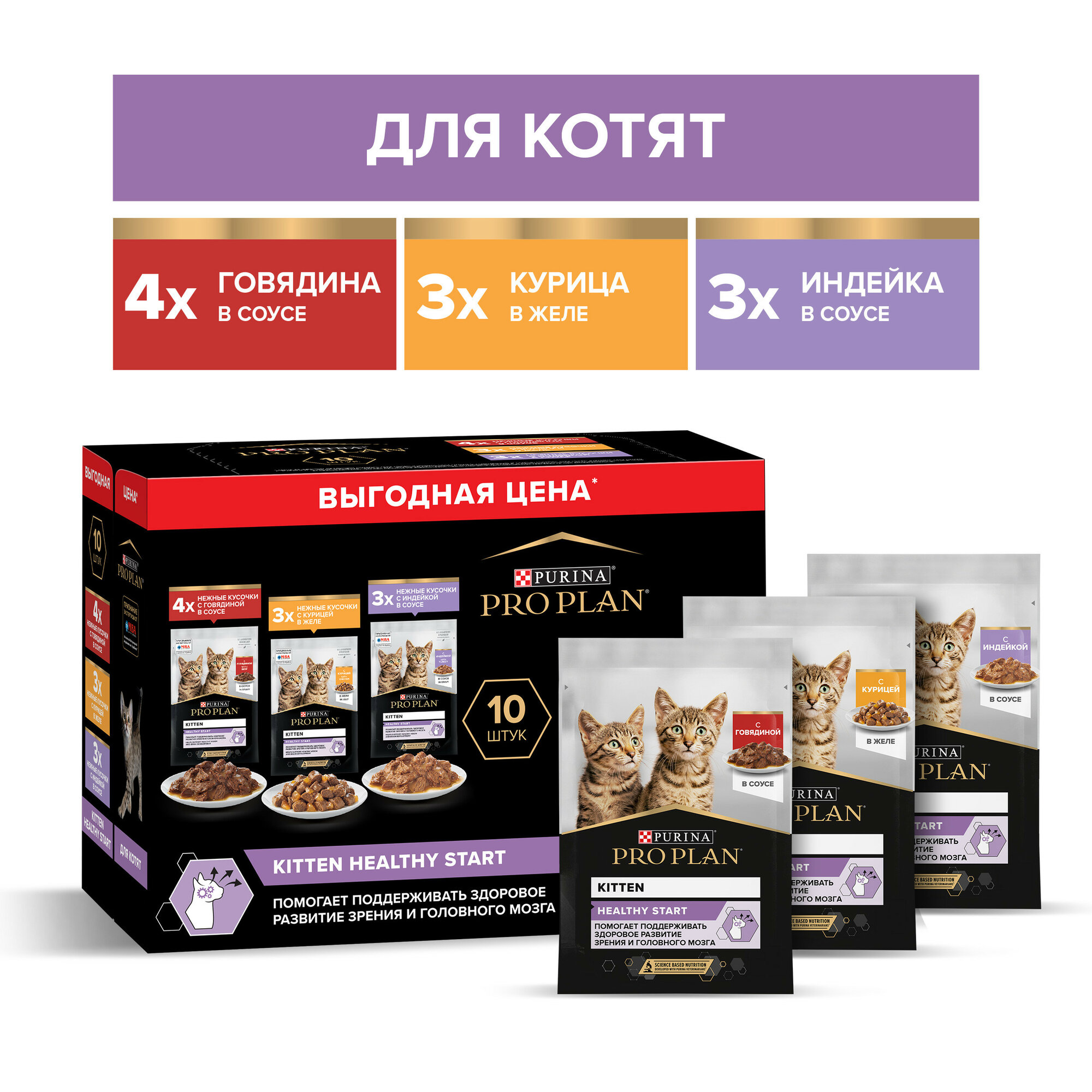 Влажный корм Pro Plan для котят с говядиной в соусе, с индейкой в соусе и с курицей в желе, 85 г х 10 шт.