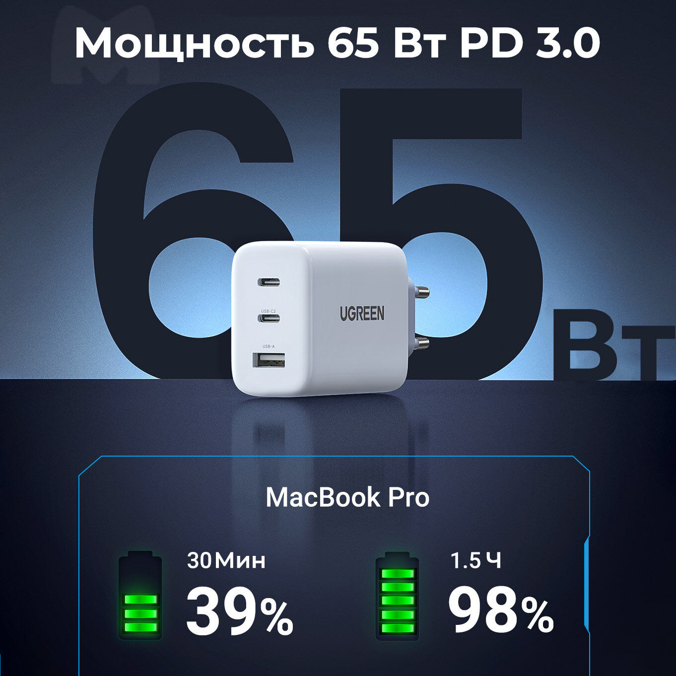 СохранитьЗарядное устройство UGREEN CD275 (90496) USB-A+2xUSB-C 65W Fast EU. белый интересное: