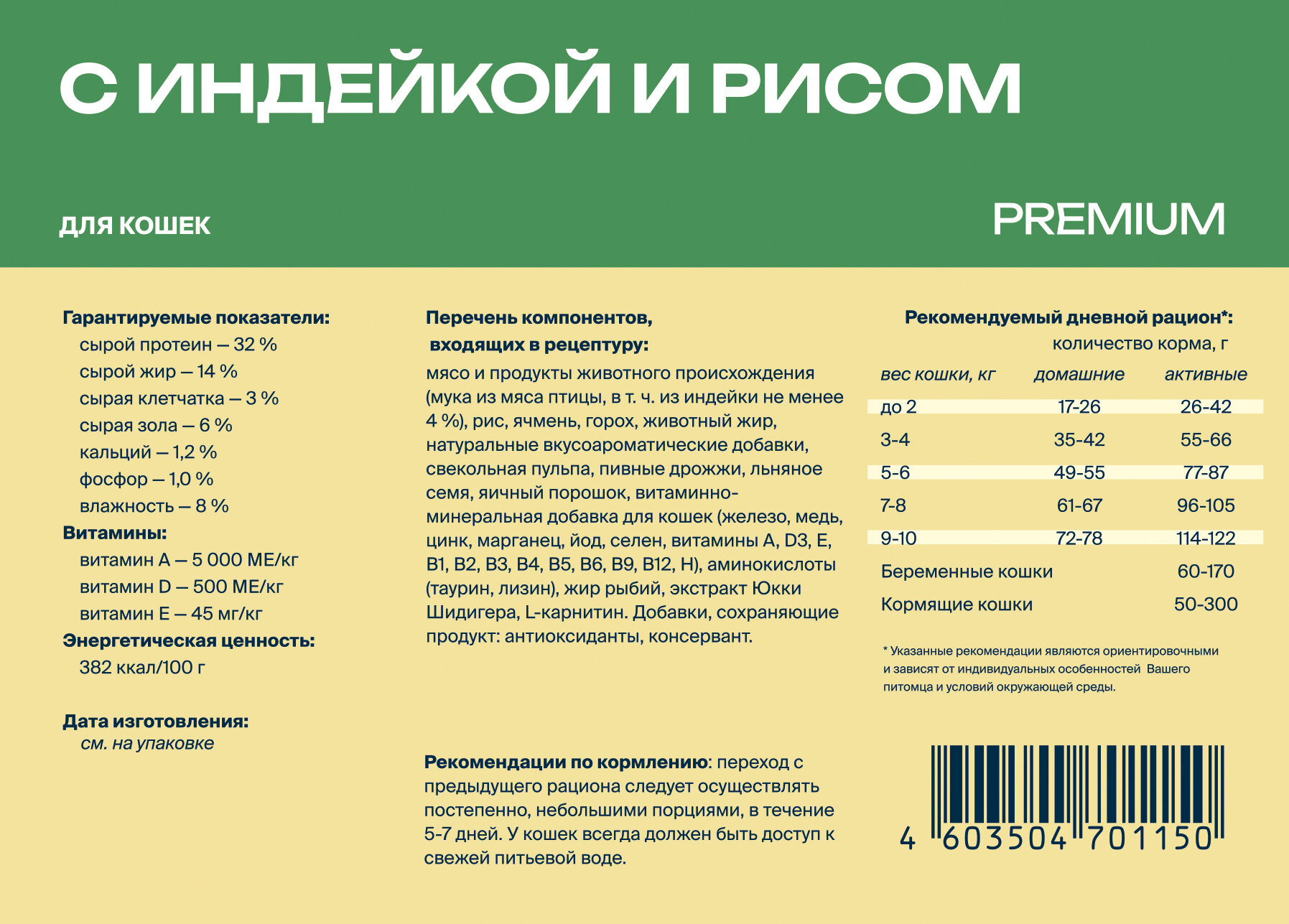| Состав | Индейка, рис, ячмень, овощи, куриный жир, печень, овес, пивные дрожжи, льняное семя, яичный порошок, минерально витаминная добавка, рыбий жир, таурин, L-карнитин, экстракт Юкки Шидигера, антиоксидант. |