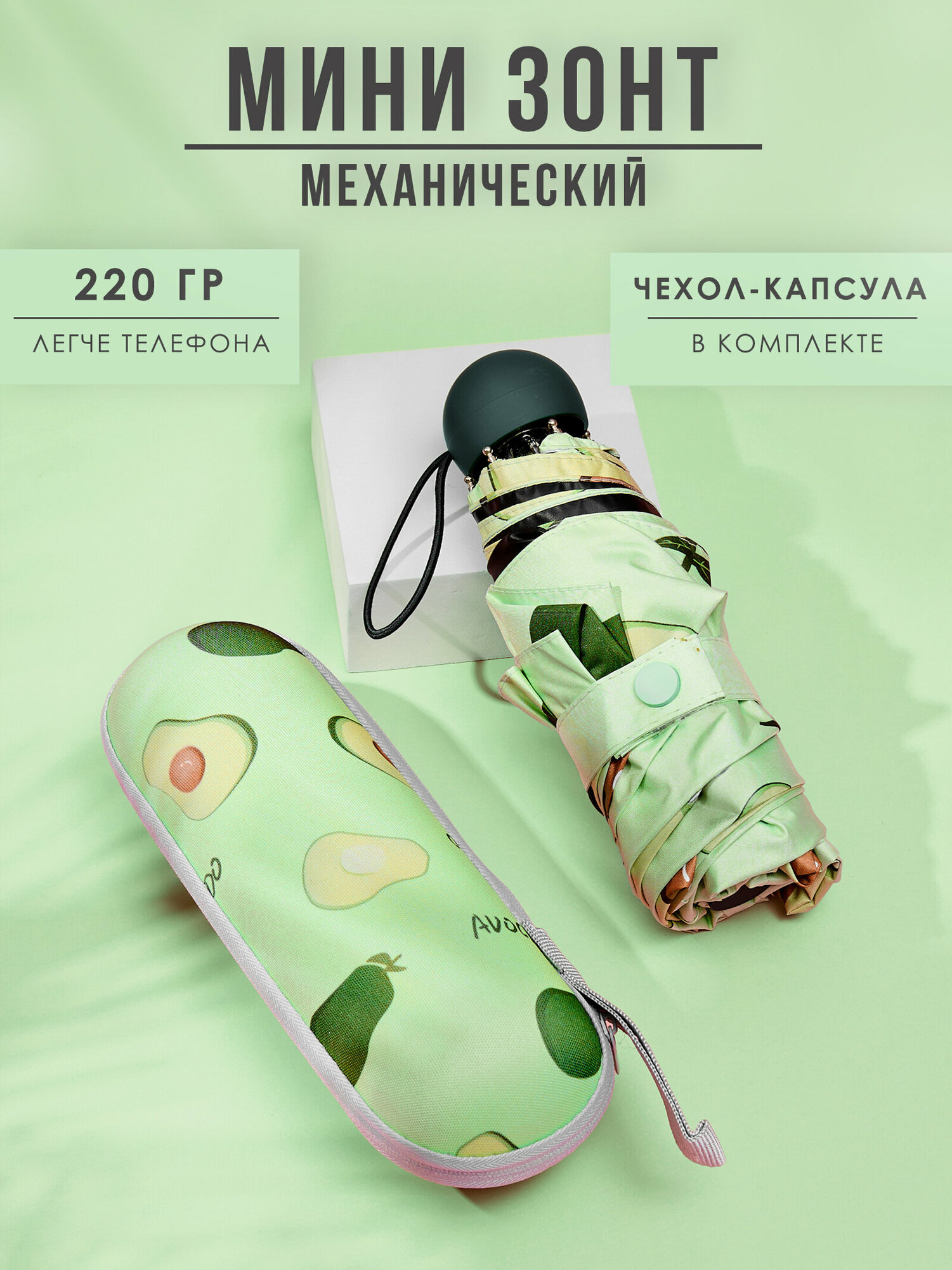 Зонт женский мини / компактный зонт облегченный / маленький зонт / зонт капсула с принтом авокадо