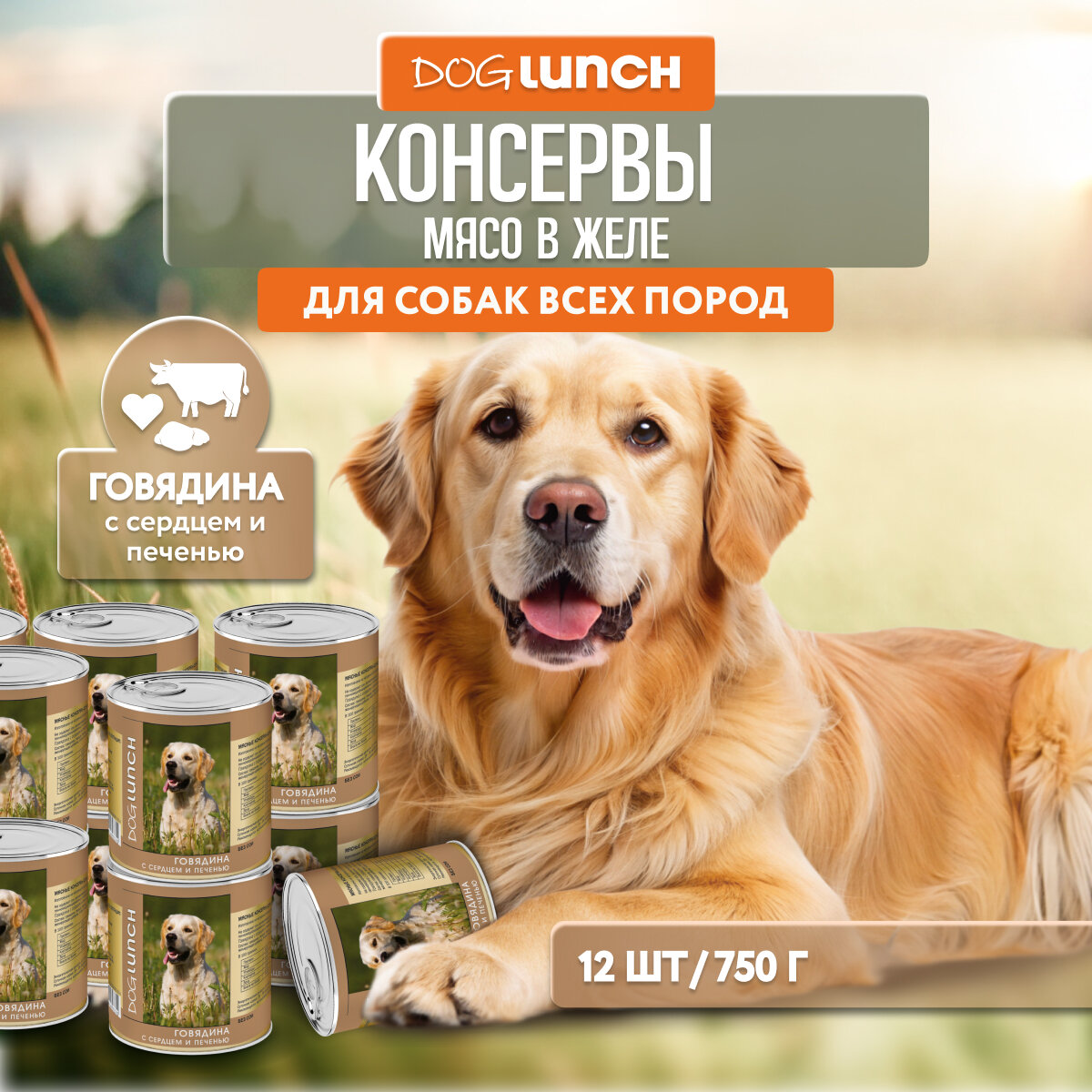 DOG LUNCH для взрослых собак с говядиной, сердцем и печенью в желе (750 гр х 12 шт)