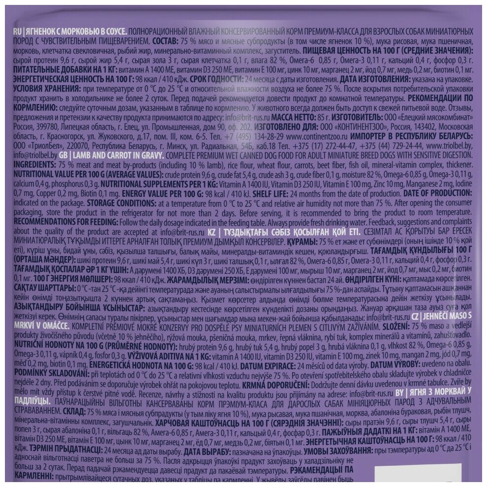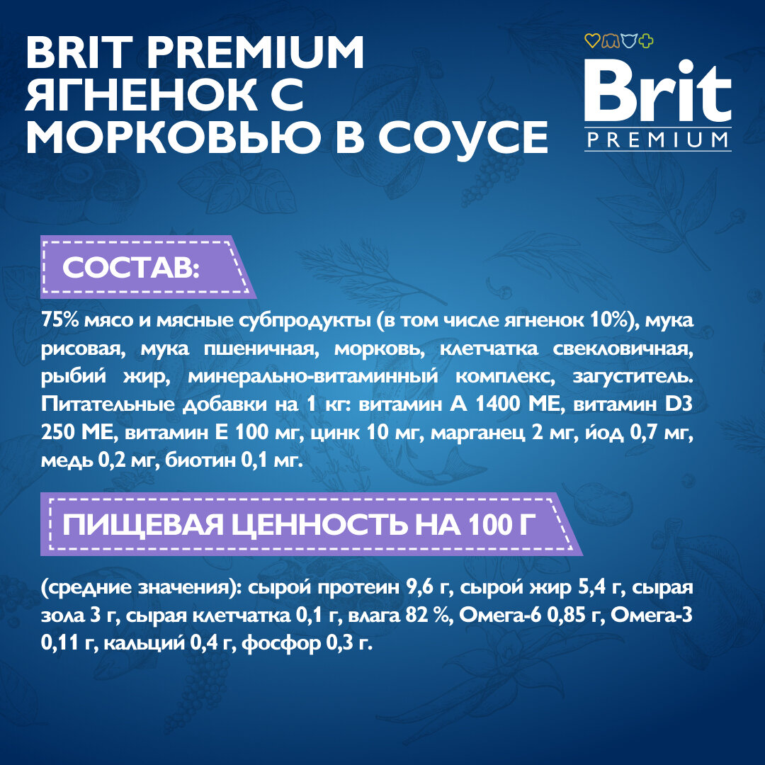 Консервированный корм BRIT PREMIUM DOG MINI LUMB & CARROT для взрослых собак маленьких пород с ягненком и морковью в соусе (85 гр х 14 шт)