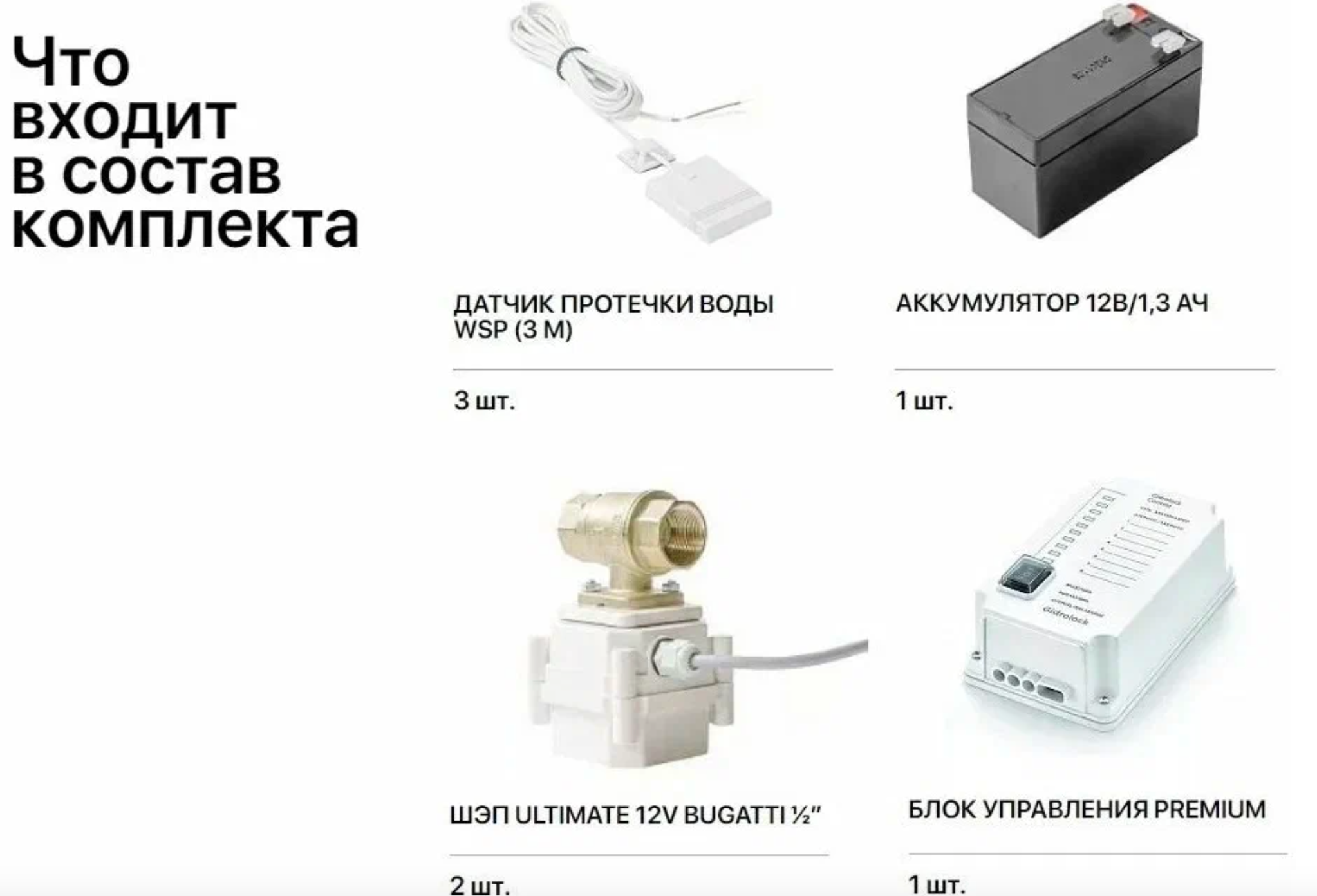 СохранитьКомплект Gidrolock с 2 кранами 3/4" Winner Bugatti с электроприводом 12V - Система защиты от протечек (потопа) в доме и квартире с проводными датчиками утечки воды (3 м провод), 31203022 интересное: