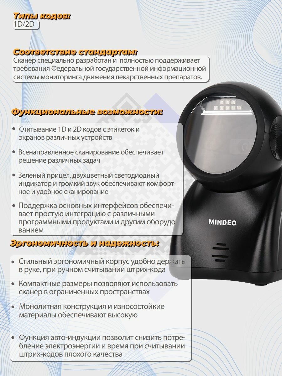 Сканер штрих-кодов Mindeo MP725BLACK презентационный, 2D имидж,Подходит для фгис (аптечные ЕГАИС)