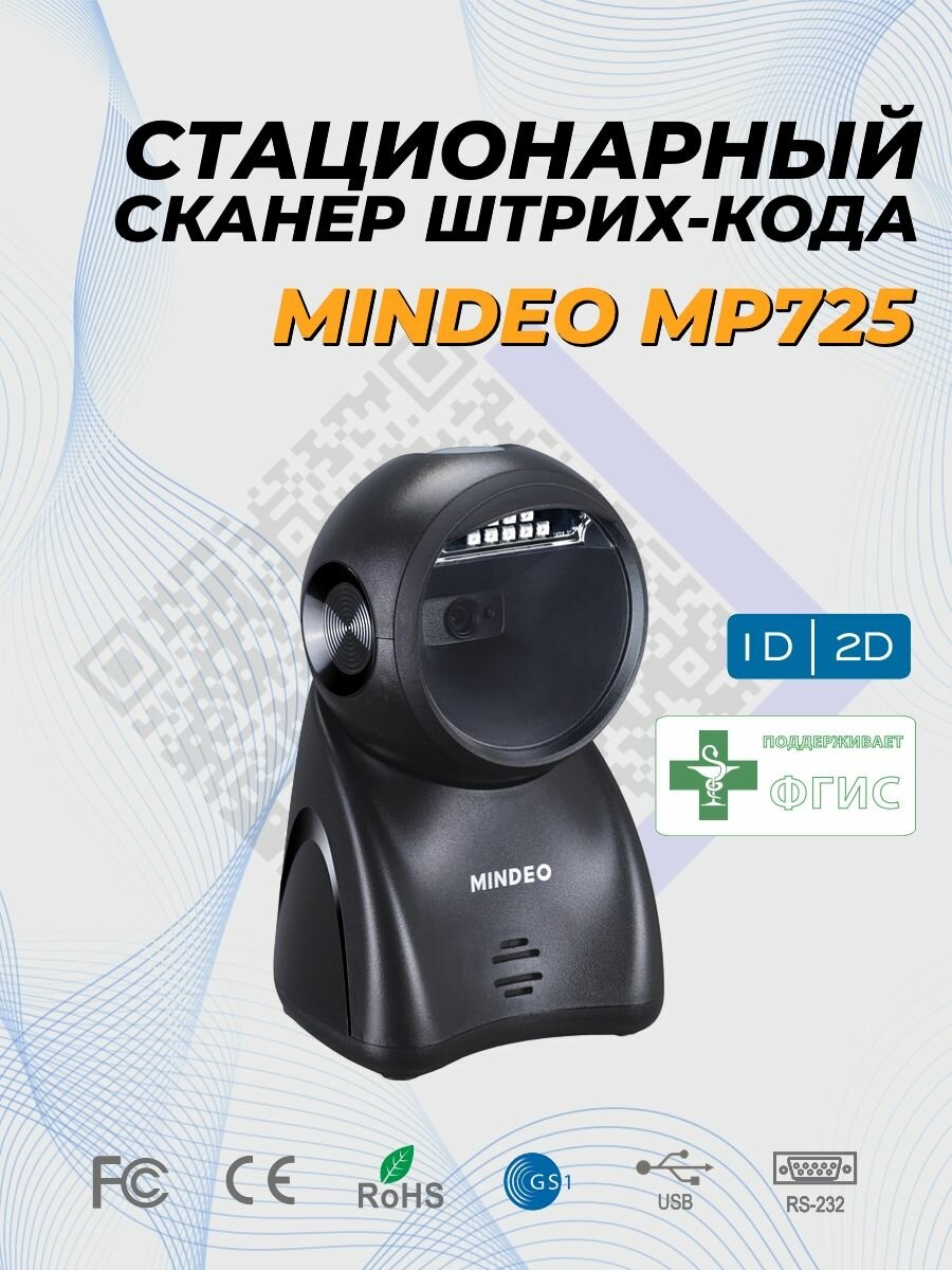Сканер штрих-кода MINDEO MP725, USB (презентационный, 2D имидж, черный)