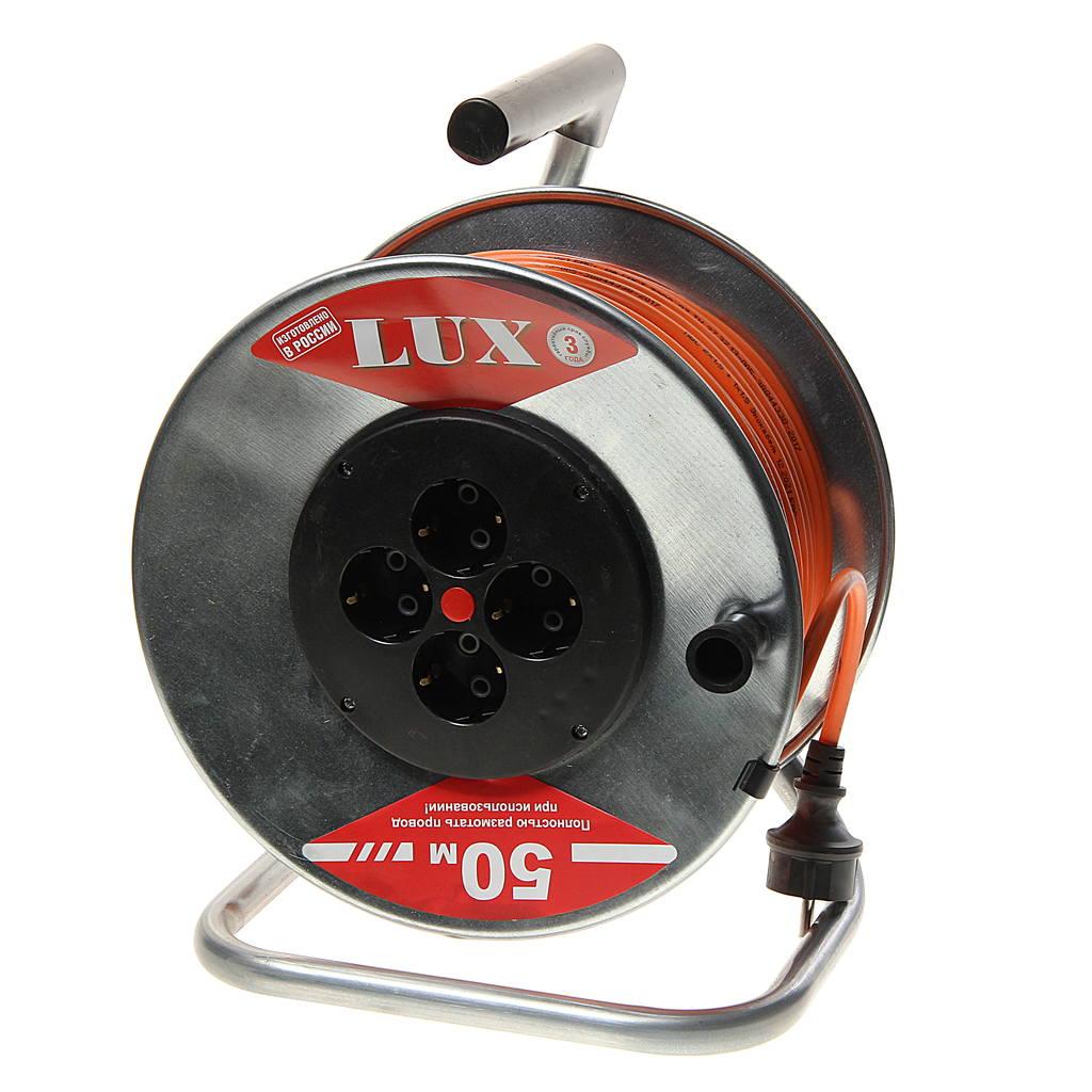 Удлинитель силовой LUX К4-Е-50, розеток 4шт, 3x1.5 кв.мм, 16A, 50м, ПВС, катушка металлическая [40150]